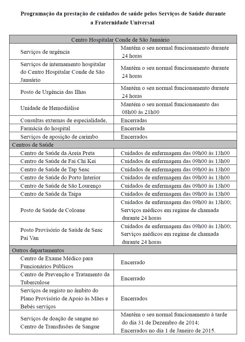 Dado que na parte da tarde do dia 31 de Dezembro de 2014 (quarta-feira) e o dia 1 de Janeiro de 2015 (quinta-feira) são feriados, respectivamente, Véspera do Dia da Fraternidade Universal, dia de tolerância de ponto para os trabalhadores da administração pública aprovada pelo Chefe do Executivo e dia da Fraternidade Universal, os serviços públicos não funcionam.