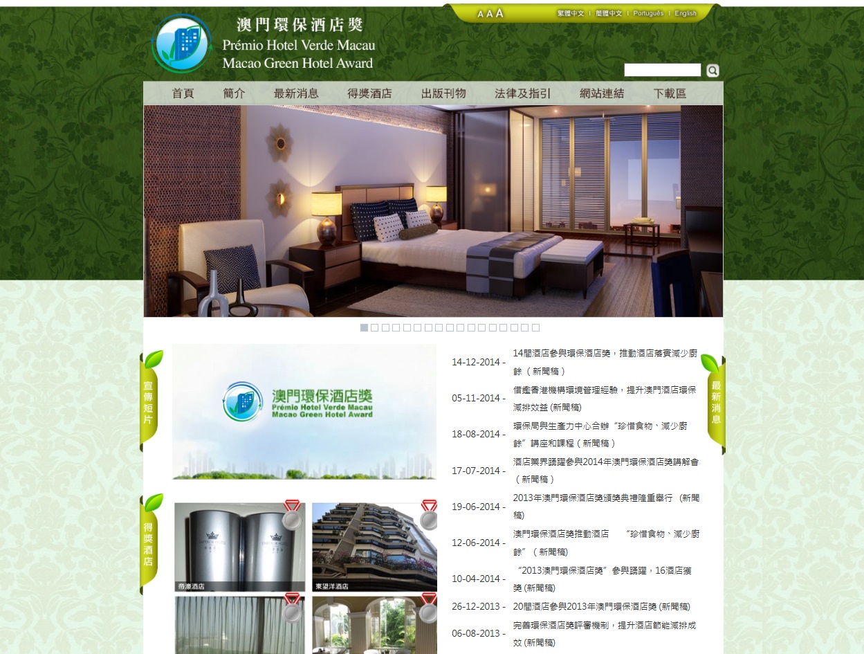 Após uma série de processos de rigorosa avaliação face ao evento do “Prémio Hotel Verde Macau 2014” organizada pela Direcção dos Serviços de Protecção Ambiental (DSPA), o júri confirmou os seguintes 13 hotéis premiados: The Venetian Macao-Resort-Hotel, MGM Macau e Hotel Beverly Plaza foram premiados com o prémio de ouro; Galaxy Hotel Macau, Mandarin Oriental Macau, Hotel Guia, Hotel Royal e Waldo Hotel foram premiados com o prémio de prata; Grandview Hotel, Pousada Marina Infante e Fu Hua Guang Dong Hotel foram premiados com o prémio de bronze; e 2 hotéis económicos foram premiados com o “Prémio de Mérito”. O “Prémio Hotel Verde Macau 2014” é válido por três anos. Sendo 1 hotel de 4 estrelas (Hotel Beverly Plaza) premiado com o prémio de ouro e 2 hotéis económicos (Hong Thai Hotel e 5 Footway Inn) premiados com o “Prémio de Mérito” pela primeira vez. Esta iniciativa obteve grande sucesso.