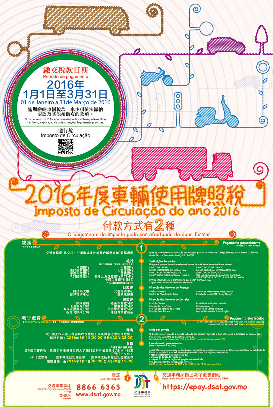 Ao abrigo do Regulamento do Imposto de Circulação, a DSAT cobra o imposto de circulação de automóveis, motociclos/ciclomotores e máquinas industriais do ano de 2016 entre 1 de Janeiro e 31 de Março de 2016. Para efectuar o pagamento, os cidadãos podem dirigir-se à Área de atendimento da DSAT (sitas, respectivamente, na Estrada de D. Maria II, n.º 33, rés-do-chão, na Avenida da Praia Grande, Edifício China Plaza, 3.º andar, e na Rua Nova da Areia Preta, n.º 52, Centro de Serviços da RAEM, 1.º andar, Zona I), Direcção dos Serviços de Finanças (Edifício “Finanças”, Centro de Atendimento da Zona Norte, Centro de Atendimento Taipa e Recebedorias da DSF - “Long Cheng”), instituições bancárias indicadas: incluindo Banco da China (33 sucursais), Banco Tai Fung, S.A.R.L (25 sucursais), Banco Comercial de Macau, S.A. (14 sucursais), Banco Nacional Ultramarino, S.A. (17 sucursais, salvo a sede), Banco OCBC Weng Hang, S.A. (13 sucursais), Banco Delta Ásia, S.A.R.L. (8 sucursais), Banco Luso Internacional, S.A.R.L. (5 sucursais), The Hong Kong and Shanghai Banking Corporation Limited, Sucursal de Macau (sede), Banco Industrial e Comercial da China (MACAU), S.A. (18 sucursais) e Direcção dos Serviços de Correios (Estação Central, Estação da Almirante Lacerda, Estação da Nova Tapa, Estação Mong Há, Estação dos Jardins do Oceano, Estação do Centro Cultural, Estação do Seac Pai Van e Loja do Museu das Comunicações).