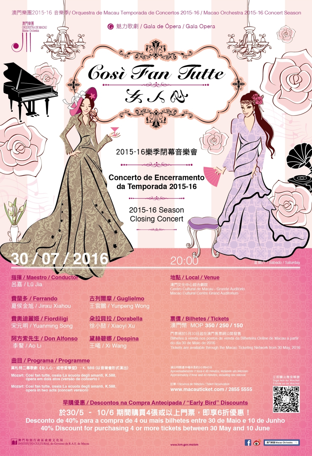 Os bilhetes para o concerto de encerramento da Temporada de Concertos da OM 2015-16, Così fan tutte, encontram-se à venda aos preços de MOP350, MOP250 e MOP150. Está disponível um desconto de 40% na compra antecipada de quatro ou mais bilhetes, no período compreendido entre 30 de Maio e 10 de Junho. Linha directa de reserva de bilhetes: 2855 5555. Para mais informações sobre o programa da Temporada de Concertos da OM 2015-2016, é favor visitar a página electrónica da OM em www.icm.gov.mo/om.