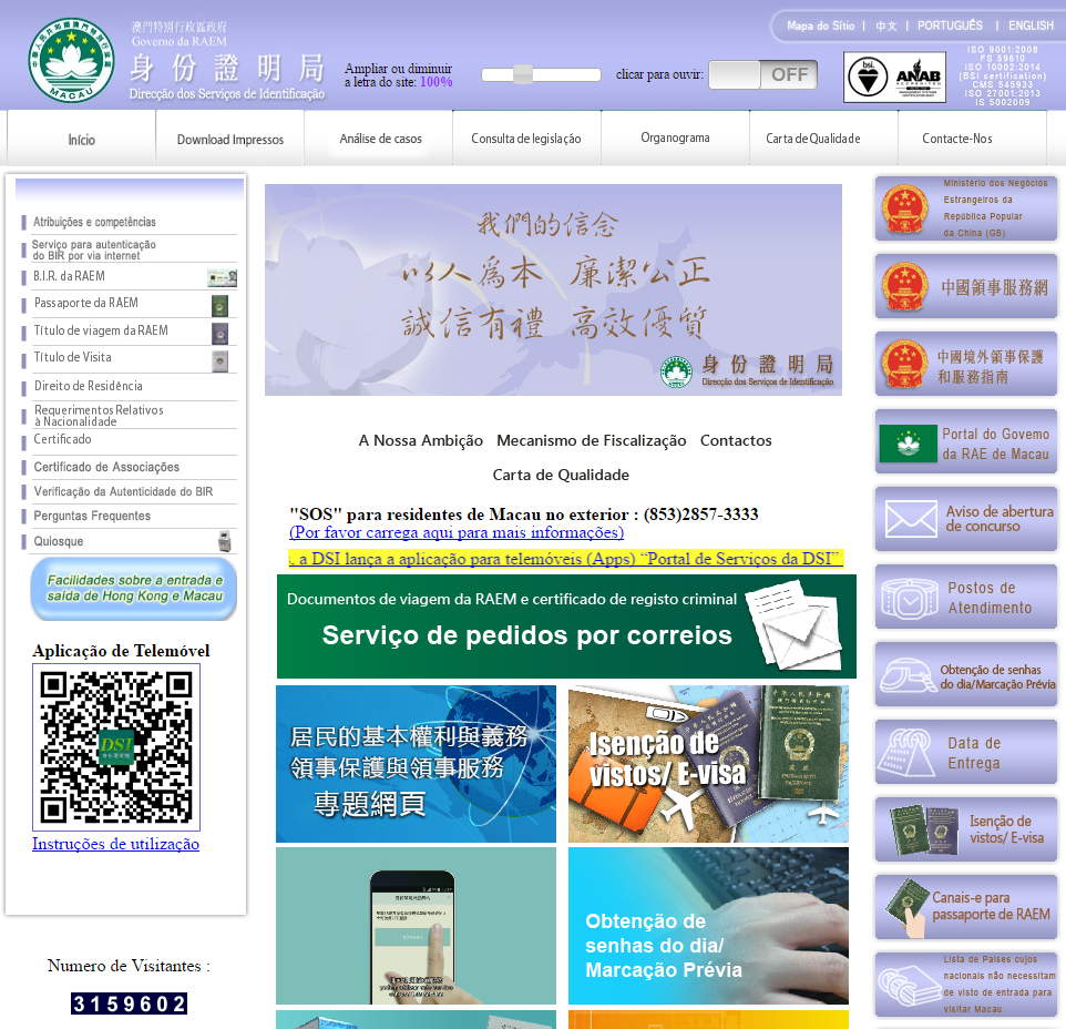Em harmonia com os princípios governativos, os Serviços de Identificação (DSI), mantém-se empenhado na investigação e no desenvolvimento de serviços electrónicos e simplificação dos procedimentos administrativos, e com vista à optimização das formalidades para os pedidos de certificados de registo criminal e documentos de viagens da RAEM, a DSI lança, a partir de 5 de Decembro de 2016, a consulta on-line do andamento de requerimentos de certificados de registo criminal e documentos de viagem da RAEM e o pagamento on-line de taxas de emissão dos ditos documentos, podendo os requerentes que se encontram no exterior de Macau acederem ao website da DSI (webportal.dsi.gov.mo/postal) cliquem no sistema “Serviço de pedidos por correios”, para consultar o andamento do requerimento e efectuar o pagamento das taxas de emissão e serviço de remessa por cartão de crédito.