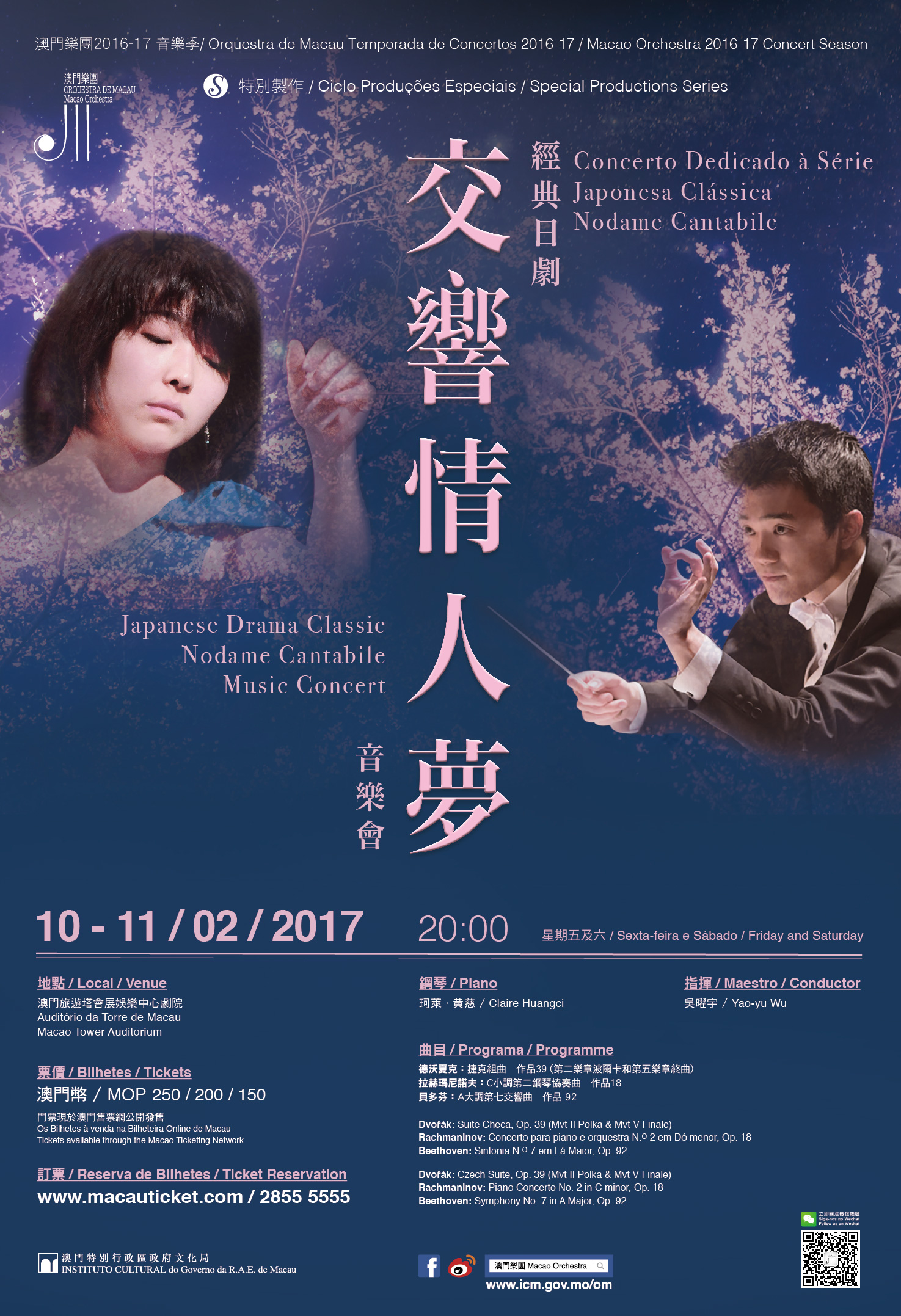 O Concerto Dedicado à Série Japonesa Clássica Nodame Cantabile, apresentado pela Orquestra de Macau (OM), sob a égide do Instituto Cultural, a ser realizado no dia 21 de Fevereiro, tem sido muito procurados pelo público, estando quase esgotados os bilhetes depois de serem colocados à venda. A fim de dar resposta ao entusiasmo do público, a OM ira apresentar um concerto adicional no dia 10 de Fevereiro, pelas 20:00 horas, estando os bilhetes respectivos à venda a partir de 16 de Janeiro na Bilheteira online de Macau, devendo os adicionados de música aproveitar esta oportunidade de adquirir bilhetes com brevidade.