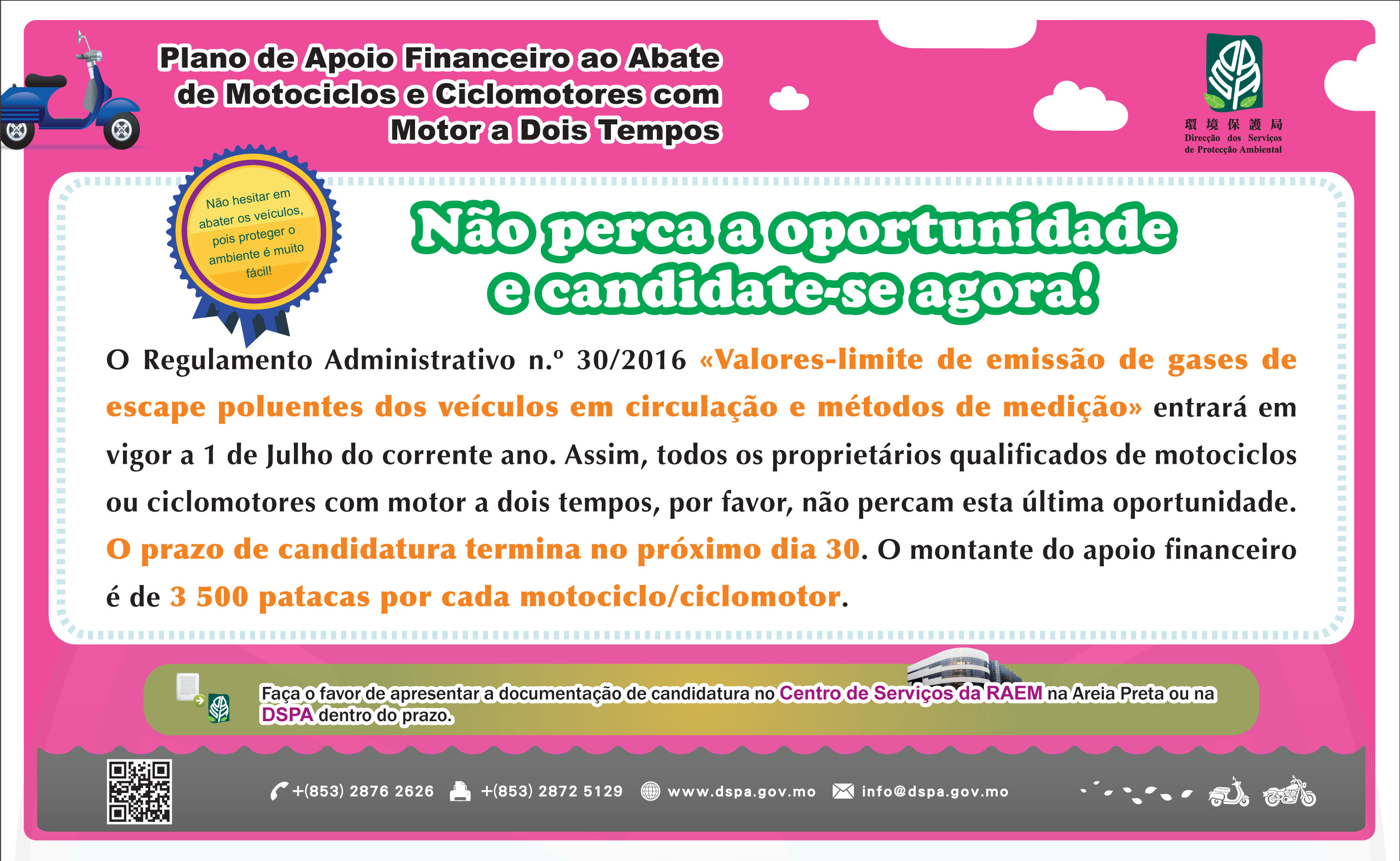 Tendo em conta a entrada em vigor do Regulamento Administrativo n.º 30/2016 «Valores-limite de emissão de gases de escape poluentes dos veículos em circulação e métodos de medição» a partir de 1 de Julho, a DSPA apela, novamente, aos proprietários – tanto dos motociclos e ciclomotores com motor a dois tempos que não correspondam aos padrões, como de outros motociclos e ciclomotores com motor a dois tempos – para não perderem a última oportunidade de participação no Plano, em virtude de minimização da emissão de gases poluentes de escape dos veículos e melhoria da qualidade do ar nas vias públicas de Macau.