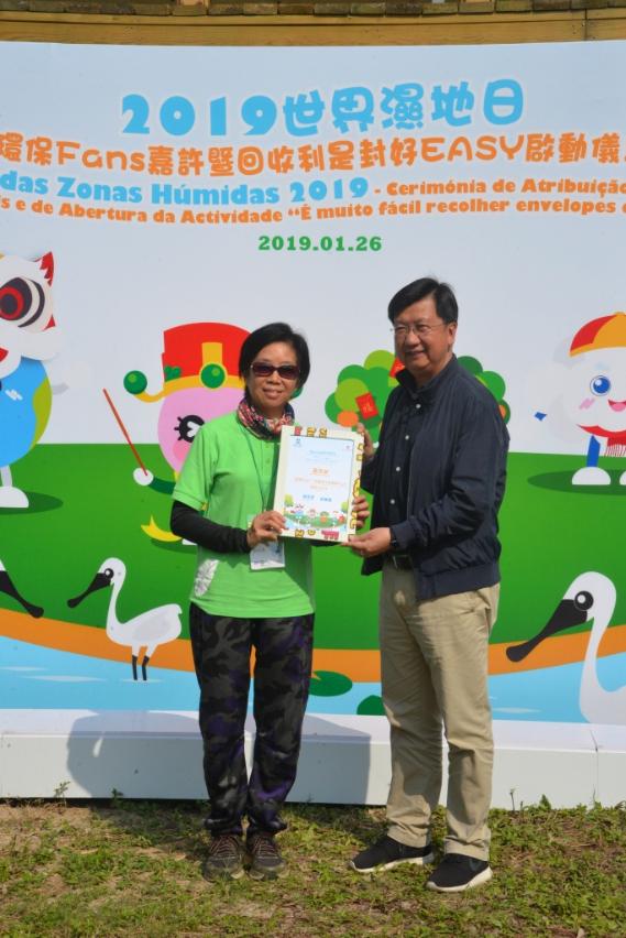 Para comemorar o Dia Mundial das Zonas Húmidas, assinalado no dia 2 de Fevereiro, assim como para divulgar as mensagens amigas do ambiente, a DSPA organiza no dia 26 de Janeiro de 2019 o referido evento nas Zonas Ecológicas do Cotai, onde o Director da DSPA, Eng. Tai Vai Man e o Sr. Leong Wai Fong, Presidente da Federação das Associações dos Operários de Macau (FAOM), quer a entidade coorganizadora do Programa de Pontos “Verdes” – O comportamento ambientalmente correcto pode ser divertido, entregam louvores aos Fãs Ambientais, os quais visam elogiar os contributos prestados a favor da sensibilização ecológica.