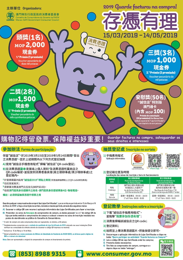 A campanha “Guarde Facturas na Compra! 2019” terá lugar entre os dias 15 de Março e 14 de Maio. Os residentes de Macau que tenham completado 15 anos de idade podem participar na campanha para ganhar prémios por sorteio, através de fazer inscrição com qualquer título comprovativo da compra, no valor não inferior a 50 patacas, efectuada entre o período acima referido. Os interessados podem completar a inscrição na aplicação informática “Lojas Certificadas” ou colocar a cópia do comprovativo de aquisição, com os dados preenchidos no seu verso, nas caixas instaladas na sede do CC e no seu posto de atendimento.
