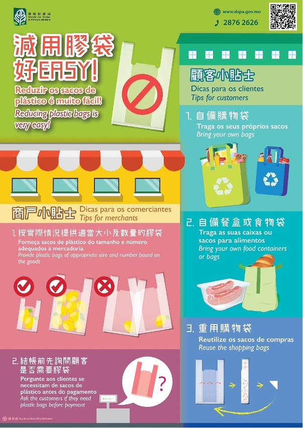 O Governo da RAEM espera a formação de uma atmosfera na redução de plástico mediante legislação. Tendo em vista que o núcleo da respectiva legislação não se centra na cobrança nem na sanção, mas que pretende reduzir o uso excessivo de sacos de plástico, apela aos cidadãos para diminuírem o uso de sacos de plástico e para trazerem os próprios sacos de compras. Propõe-se que os estabelecimentos comerciais forneçam, quando for necessário, sacos de plástico em quantidade e tamanho conveniente, para conjuntamente se pôr em prática o acto de diminuição de plástico.