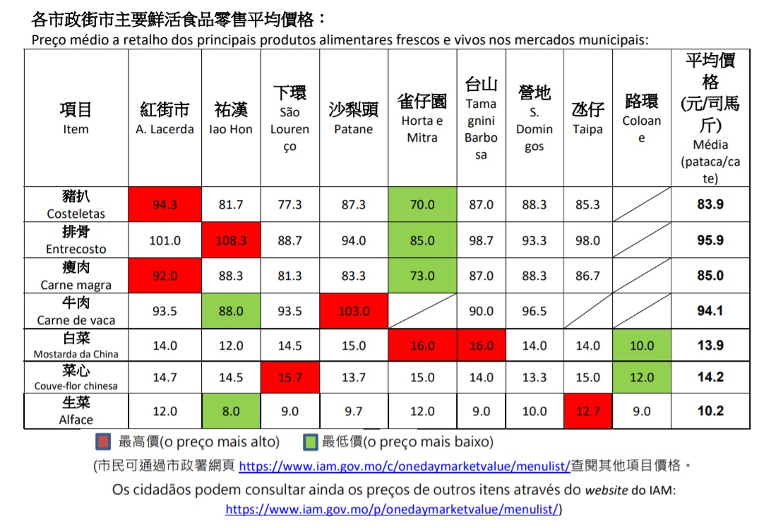 (Os cidadãos podem consultar ainda os preços de outros itens através do website do IAM: https://www.iam.gov.mo/p/onedaymarketvalue/menulist/)