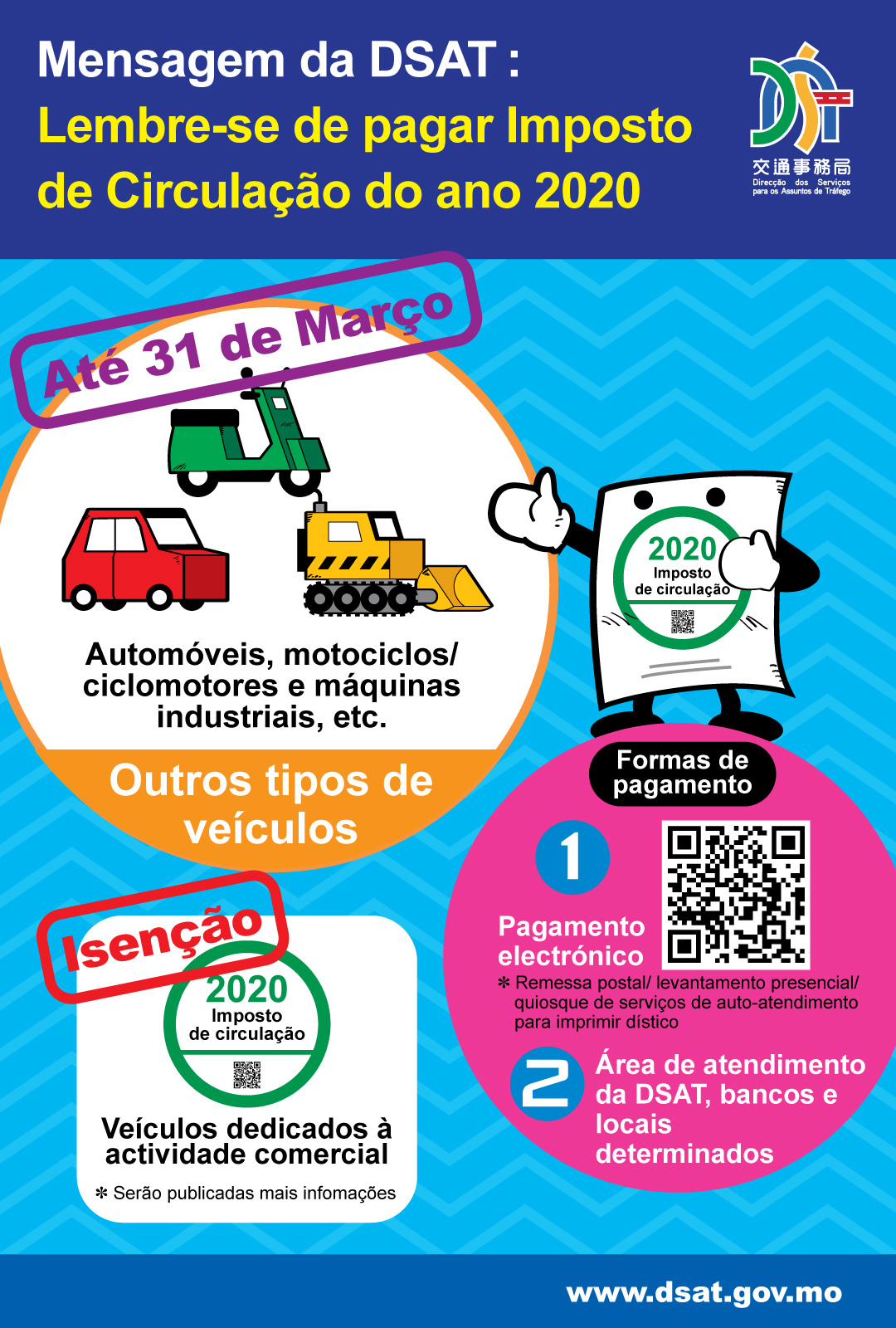 O prazo para o pagamento do imposto de circulação de 2020 termina a 31 de Março (terça-feira). Com a retomada do funcionamento normal dos serviços públicos, os proprietários têm de assumir o dever de pagar o imposto, podendo proceder ao mesmo na área de atendimento da DSAT. Em articulação com os trabalhos de prevenção epidémica do Covid-19 e por forma a evitar a aglomeração de pessoas nas instalações e a economizar o tempo de espera dos cidadãos, A DSAT apela a que os proprietários de veículos possam pagar o referido imposto através dos meios electrónicos disponibizados para o efeito, ou seja, a página electrónica https://epay.dsat.gov.mo, a aplicação móvel “Posto de Informação de Tráfego”, e os quiosques de serviços de auto-atendimento nos quais, também, se pode obter o dístico impresso.