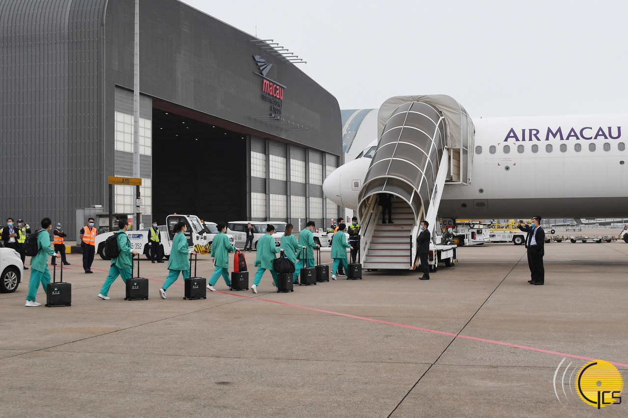 A bordo da aeronave seguiram três médicos dos Serviços de Saúde, três enfermeiros, dois funcionários da Direcção dos Serviços de Turismo, bem como sete elementos da tripulação. Antes de embarcarem, todas essas pessoas tiveram de deslocar-se, pelas 07h30, ao Centro Hospitalar Conde de São Januário para os últimos preparativos, nomeadamente a mediação de temperatura corporal e verificação dos equipamentos necessários para a viagem, de onde seguiram directamente para o Aeroporto Internacional de Macau. Já nesse local, encontraram-se com o secretário para a Administração e Justiça, André Cheong, a secretária para os Assuntos Sociais e Cultura, Ao Ieong U, e a chefe do Gabinete do Chefe do Executivo, Hoi Lai Fong, de quem receberam palavras de encorajamento.