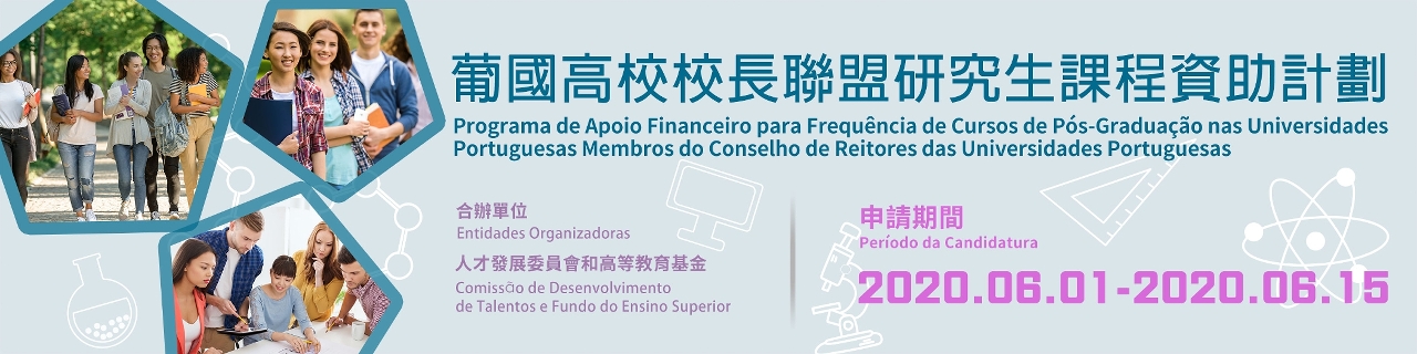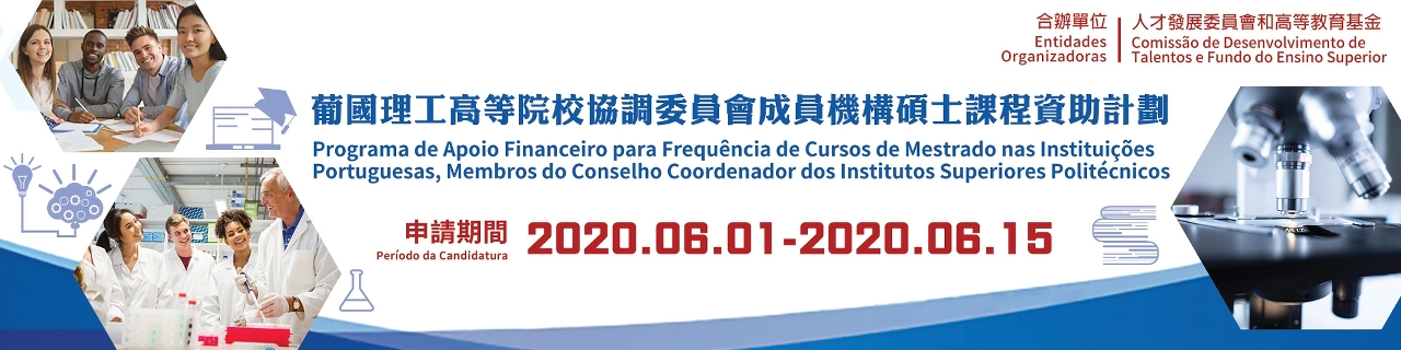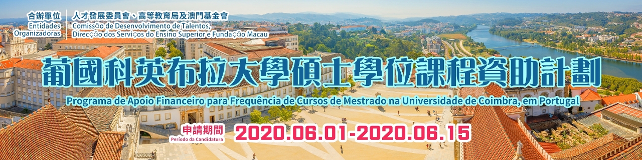 A Comissão de Desenvolvimento de Talentos vai lançar, a partir do próximo mês de Junho, os programas de concessão de apoio financeiro para a frequência dos “Cursos de Mestrado da Universidade de Coimbra em Portugal” (abaixo abreviado por “Cursos Coimbra”), dos “Cursos de pós-graduação ministrados pelas universidades portuguesas, filiadas no Conselho de Reitores das Universidades Portuguesas” (abaixo abreviado por “Cursos Conselho de Reitores”), e dos “Cursos de Mestrado nas Instituições Portuguesas Membros do Conselho Coordenador dos Institutos Superiores Politécnicos” (abaixo abreviado por “Cursos de Mestrado dos Institutos Superiores Politécnicos”, decorrendo o período para a apresentação das candidaturas entre 1 e 15 de Junho de 2020. O primeiro programa é financiado pela Fundação Macau, em colaboração com a Direcção dos Serviços do Ensino Superior, enquanto que o segundo e terceiro programas são financiados pelo Fundo do Ensino Superior.