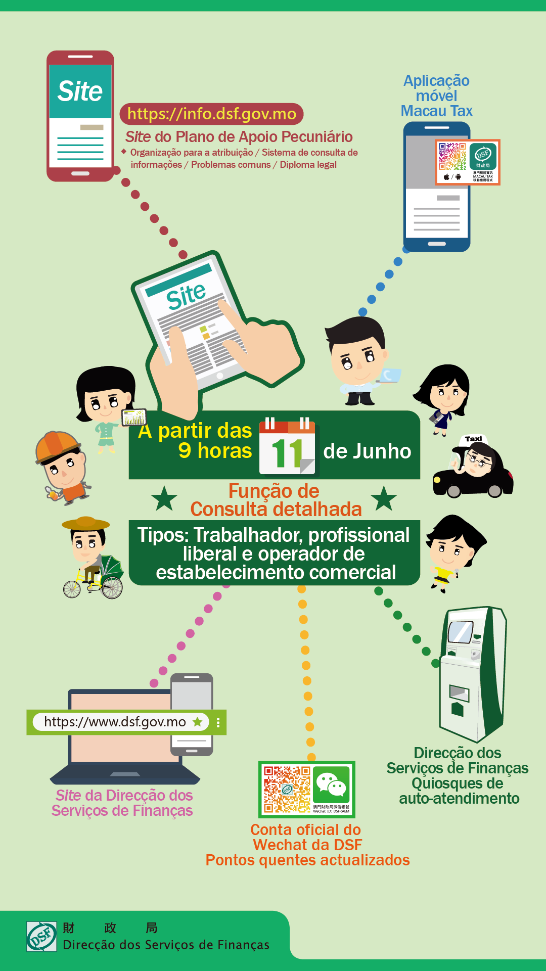 O Regulamento Administrativo n.º 19/2020, intitulado “Plano de apoio pecuniário aos trabalhadores, aos profissionais liberais e aos operadores de estabelecimentos comerciais” entrou em vigor no dia 30 de Maio de 2020. Na sequência do sistema de consulta simples sobre o apoio pecuniário aos trabalhadores, promovido no dia 2 de Junho de 2020, a Direcção dos Serviços de Finanças (DSF) vai lançar, amanhã (dia 11), pelas 09:00, o sistema de consulta detalhada.