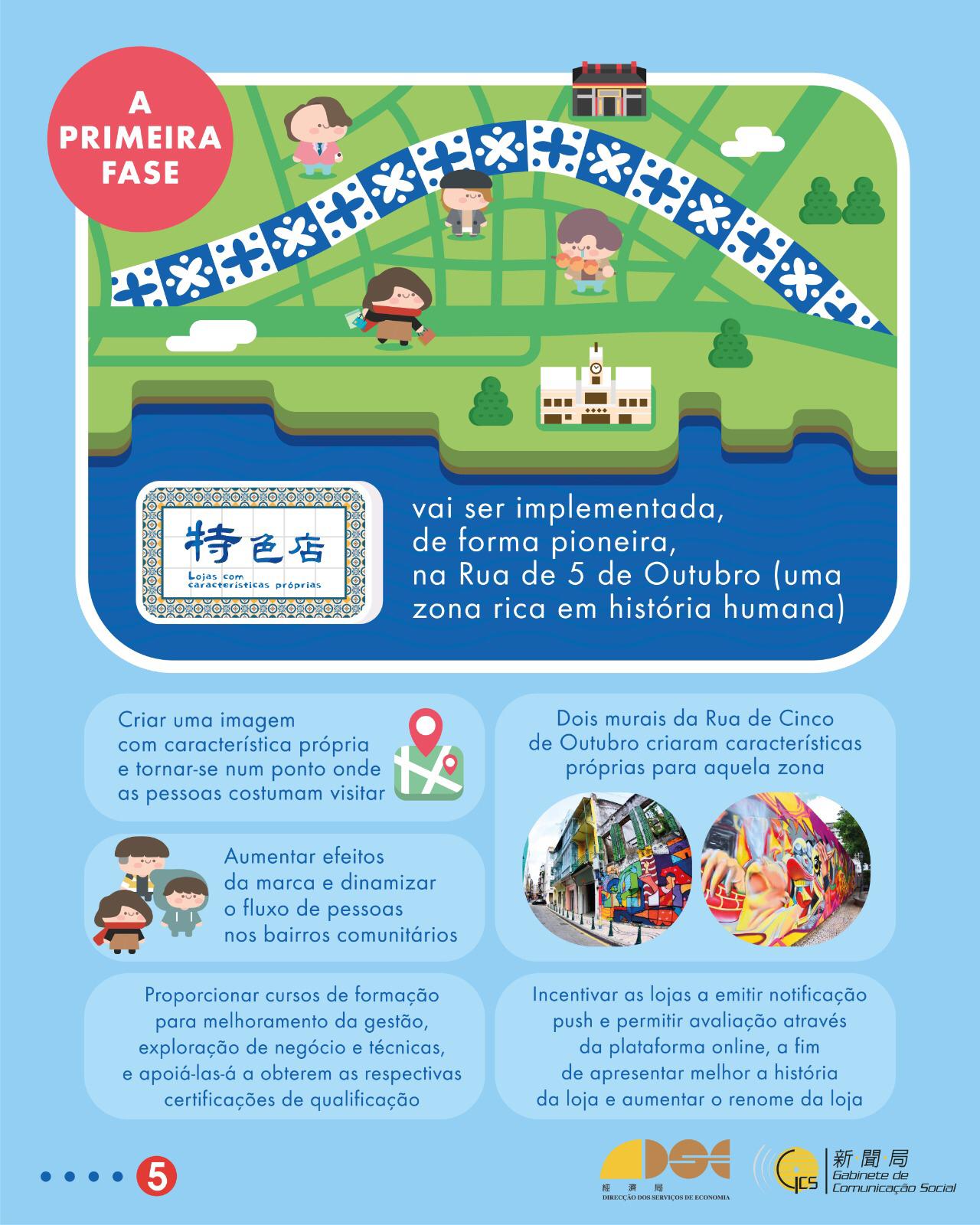 Na primeira fase do Plano, vai ser lançado, de forma pioneira, na Rua de 5 de Outubro (uma zona rica em história humana), tornando-se numa zona com imagem de características próprias e num ponto onde as pessoas costumam visitar. Ao mesmo tempo, serão proporcionados diferentes tipos de apoios a essas lojas com características próprias, nomeadamente, cursos de formação particularmente em prol do melhoramento da gestão, exploração de negócio e técnicas, e apoiá-las a obterem as respectivas certificações de qualificação, o que contribuirá para promover um novo patamar do desenvolvimento qualitativo das lojas com características próprias.