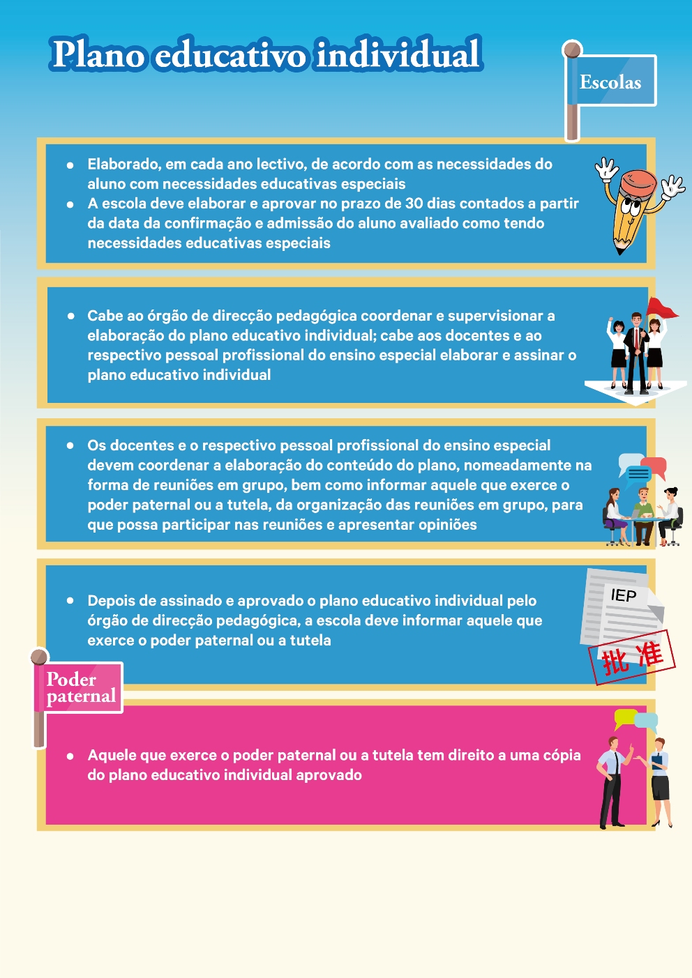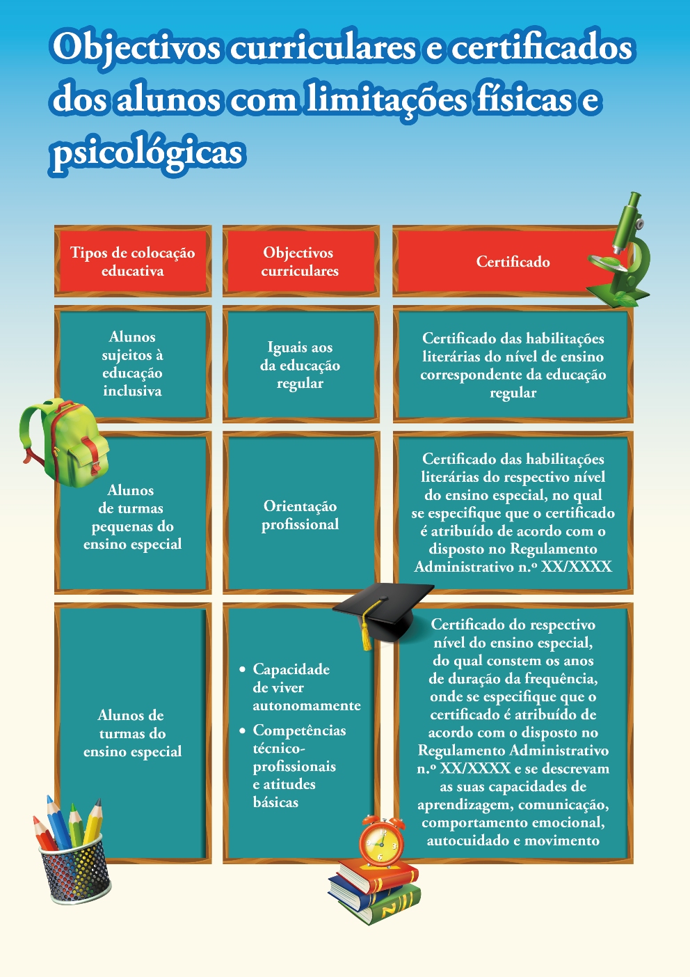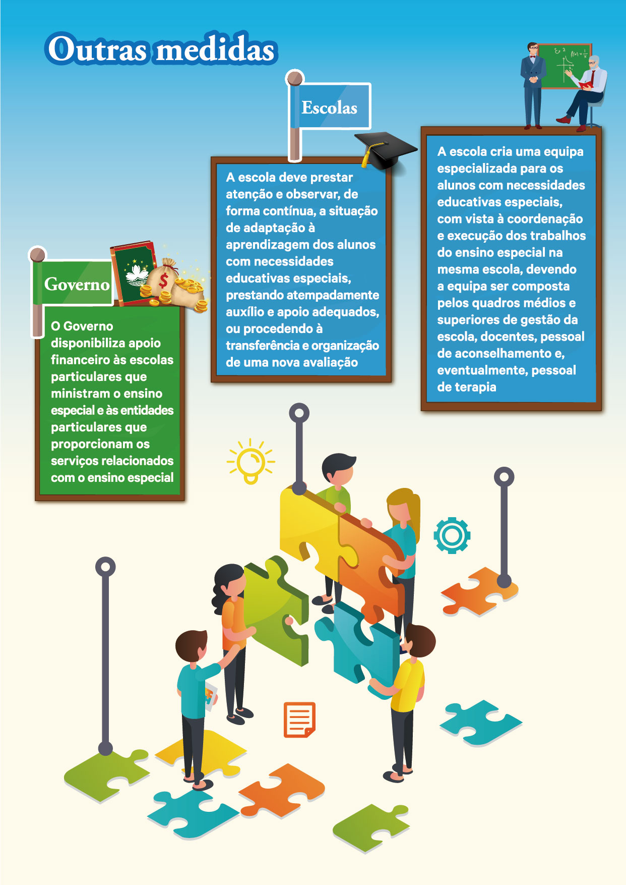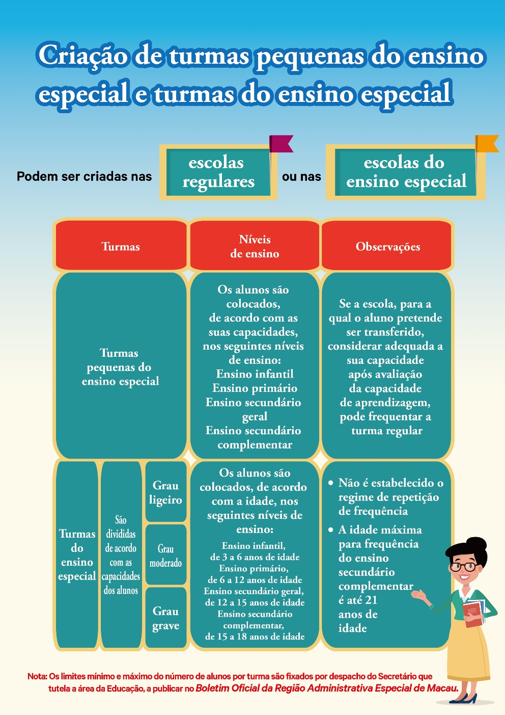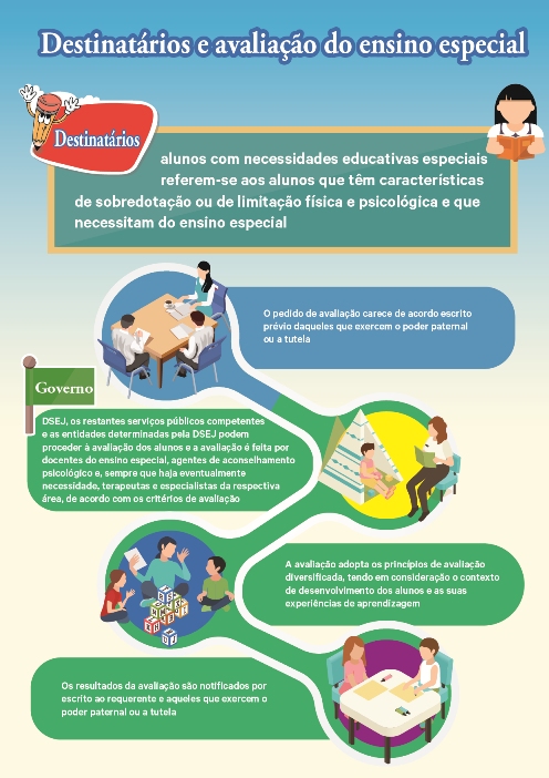 O Decreto-Lei n.º 33/96/M, que regulariza o “Regime educativo especial”, tem vindo a ser implementado há mais de vinte anos, encontrando-se algumas das suas disposições já desarticuladas com as solicitações e o desenvolvimento do ensino especial de Macau. Para prestar um apoio eficaz aos alunos com necessidades educativas especiais e promover o desenvolvimento do ensino especial, o Governo da RAEM definiu o regulamento administrativo do “Regime do ensino especial”, regularizando e tornando ainda mais concretas as medidas de apoio aos alunos com necessidades educativas especiais (alunos com limitações físicas e psicológicas e alunos sobredotados).