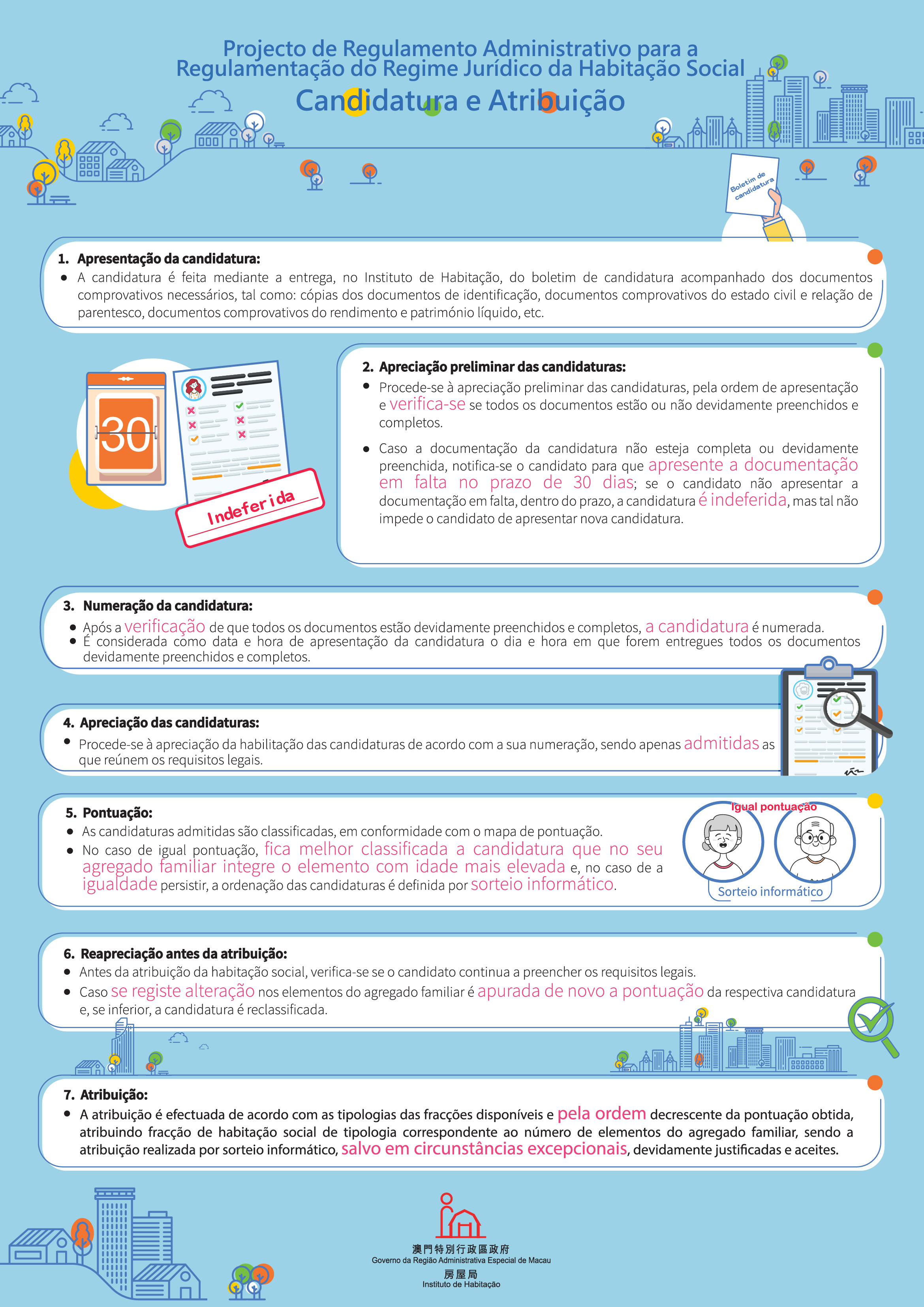 Candidatura e atribuição de habitação social. O Instituto de Habitação (IH) efectua uma apreciação preliminar das candidaturas, pela ordem de apresentação e, após verificação de que as mesmas reúnem os requisitos exigidos, a candidatura é numerada, procedendo-se à apreciação da habilitação das candidaturas de acordo com a sua numeração, sendo apenas admitidas as que reúnem os requisitos legais. Posteriormente, as candidaturas admitidas são classificadas em conformidade com o mapa de pontuação. Antes da atribuição da habitação social, verifica-se, de novo, se continuam a preencher os requisitos, sendo a atribuição da habitação social efectuada de acordo com a tipologia das fracções disponíveis e pela ordem decrescente da pontuação.
