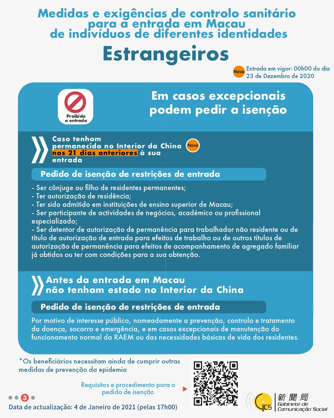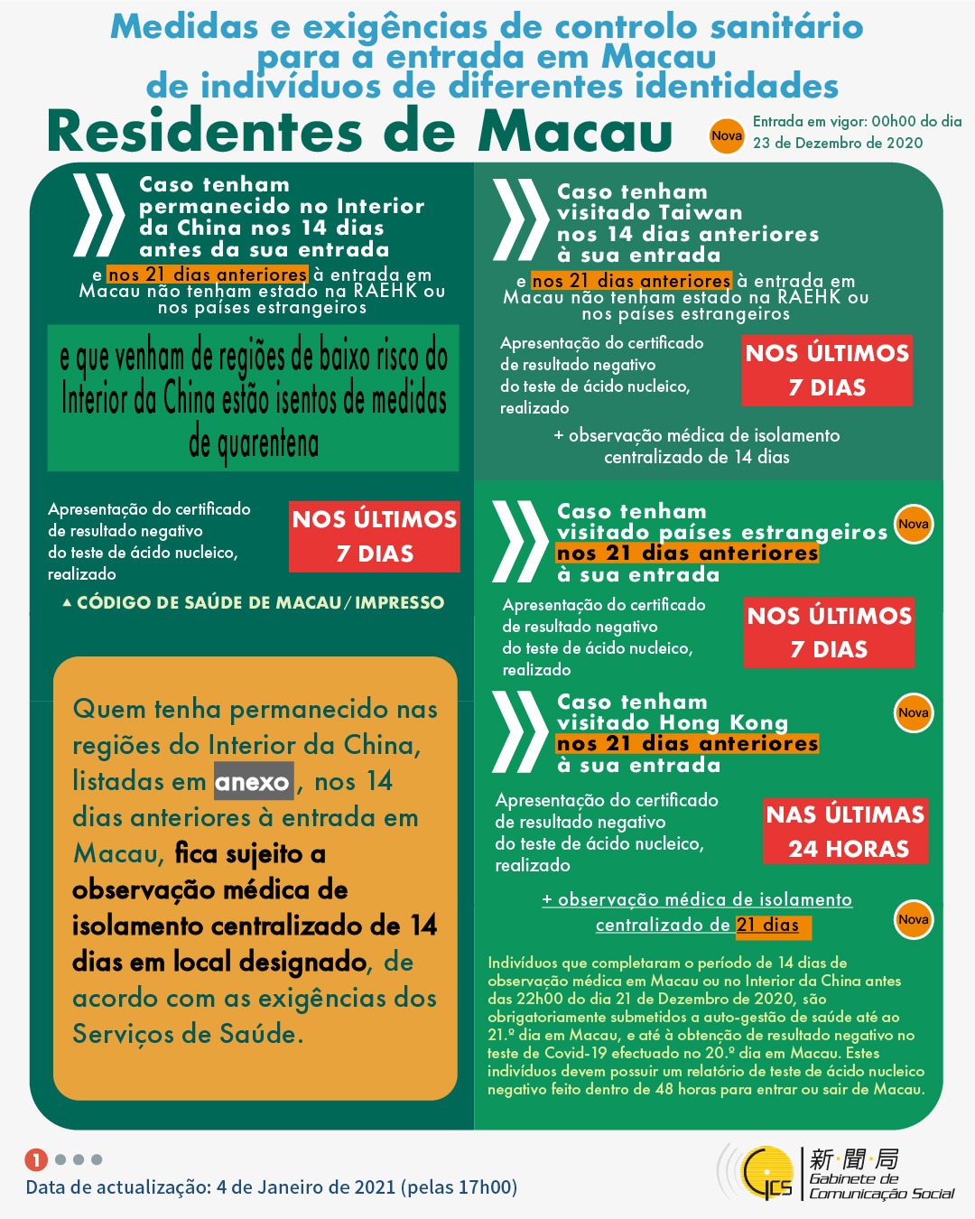 Medidas e exigências de controlo sanitário para a entrada em Macau de indivíduos de diferentes identidades