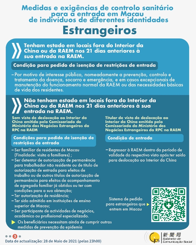 (Infografia)Medidas e exigências de controlo sanitário para a entrada em Macau de indivíduos de diferentes identidades, actualizadas no dia 28 de Maio de 2021