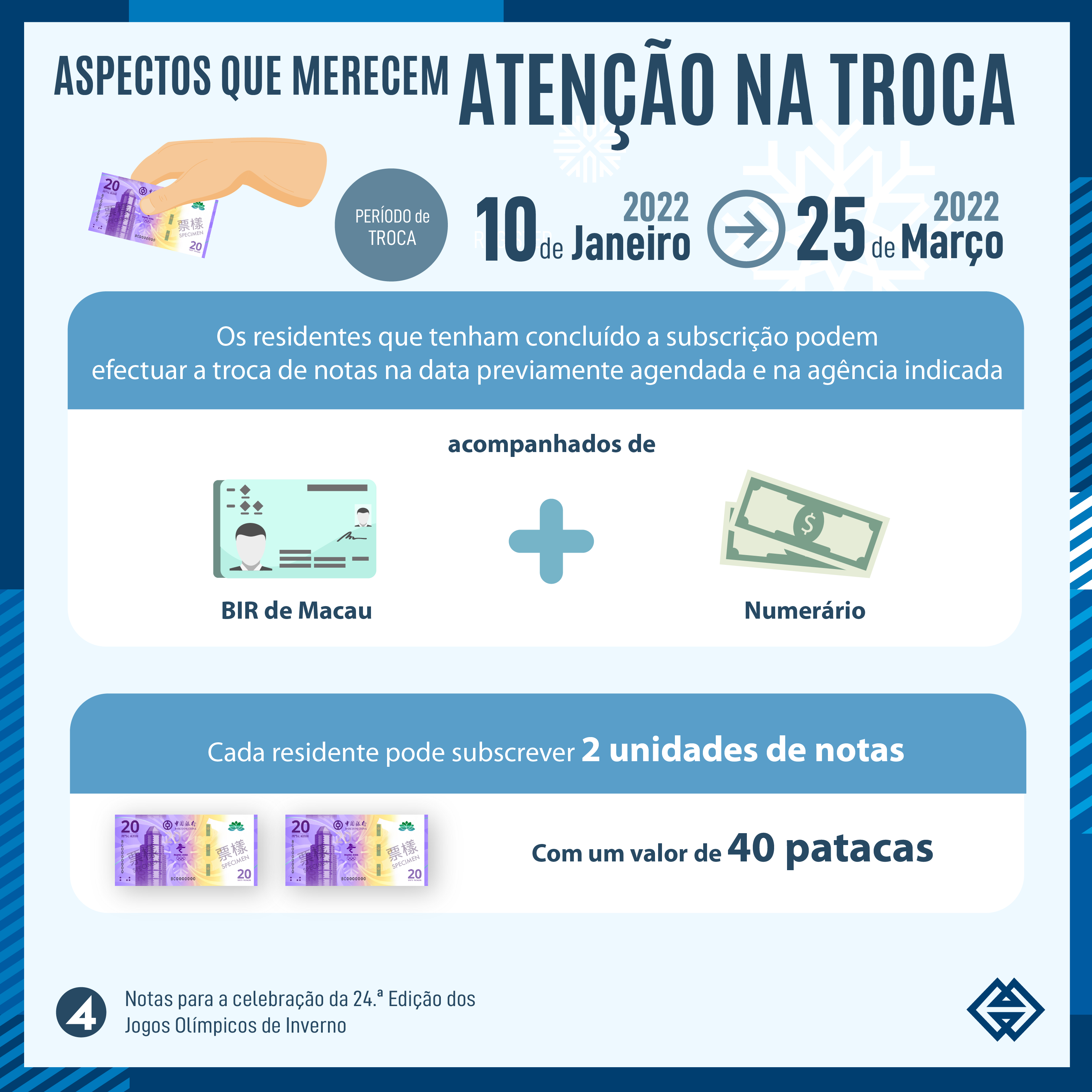 O período de troca é de 10 de Janeiro de 2022 a 25 de Março de 2022, sendo os locais de troca as agências indicadas do Banco da China, Sucursal de Macau, do Banco Nacional Ultramarino, do Banco Industrial e Comercial da China (Macau), S.A., do Banco Tai Fung, S.A., do Banco OCBC Weng Hang, S.A., do Banco Luso Internacional, S.A., do Banco Comercial de Macau, S.A., do Banco de Construção da China (Macau), S.A. e do Banco de Guangfa da China, S.A..