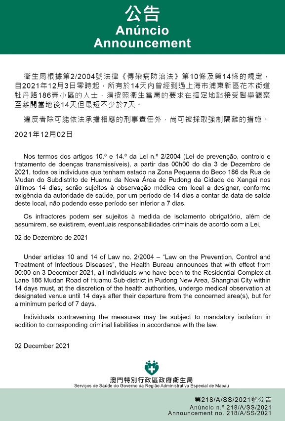 O Centro de Coordenação de Contingência do Novo Tipo de Coronavírus informa que tendo em consideração a evolução epidemiológica mais actualizada na Cidade de Xangai, nos termos dos artigos 10.º e 14.º da Lei n.º 2/2004 (Lei de prevenção, controlo e tratamento de doenças transmissíveis), a partir das 00h00 do dia 3 de Dezembro de 2021, todos os indivíduos que tenham estado na Zona Pequena do Beco 186 da Rua de Mudan do Subdistrito de Huamu da Nova Área de Pudong da Cidade de Xangai nos últimos 14 dias, serão sujeitos à observação médica em local a designar, conforme exigências da autoridade de saúde, por um período de 14 dias a contar da data de saída deste local, não podendo esse período ser inferior a 7 dias.