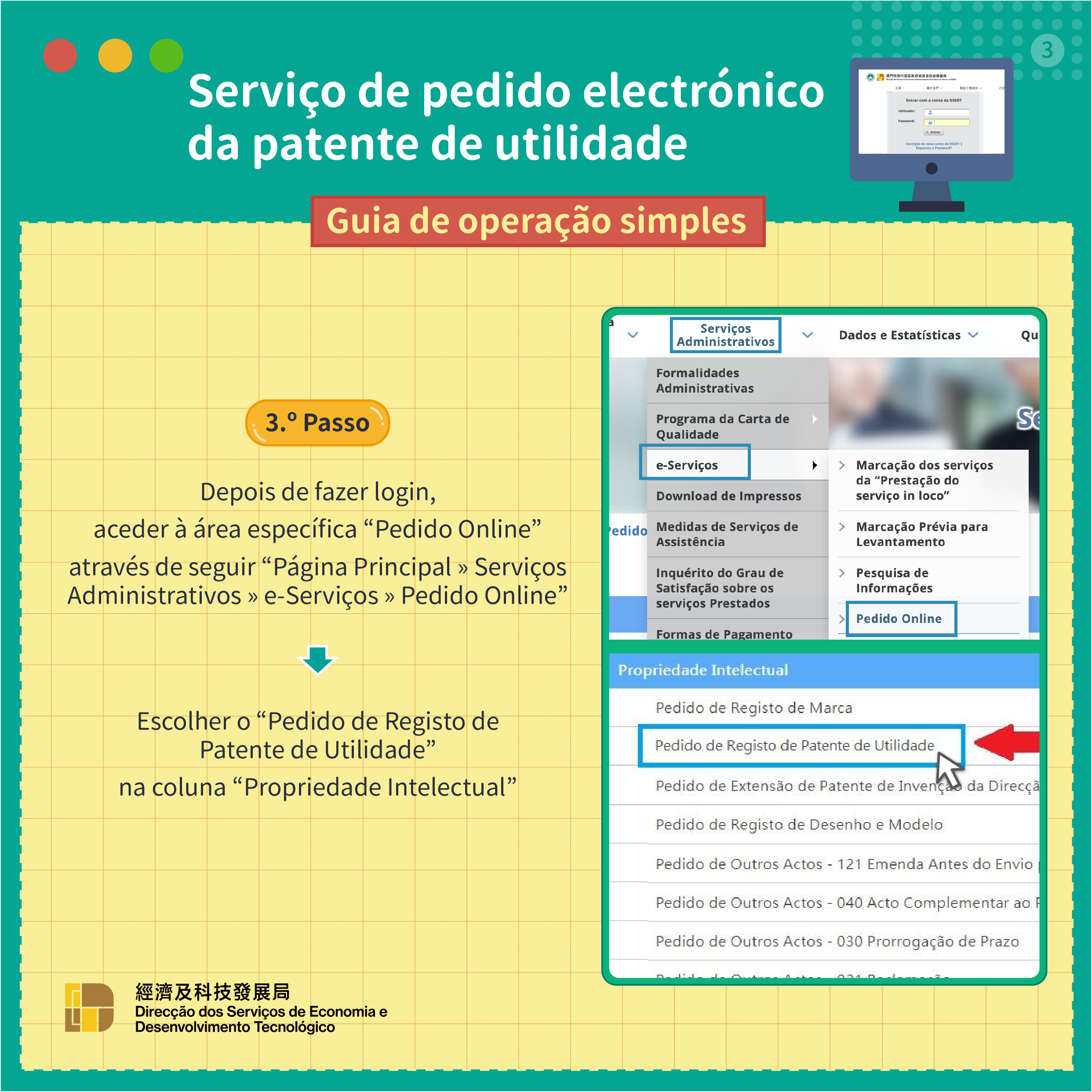 Para promover constantemente o desenvolvimento do governo electrónico, prestando serviços públicos de boa qualidade mais convenientes aos cidadãos e às empresas, a Direcção dos Serviços de Economia e Desenvolvimento Tecnológico (DSEDT) acrescentará, a partir de 13 de Junho de 2022, o “serviço de pedido electrónico da patente de utilidade”. Os requerentes podem apresentar os seus pedidos de registo de patentes de utilidade electronicamente através do sistema de serviços do website da DSEDT, e completando todo o processo, incluindo o preenchimento de informações, o carregamento de documentos e o pagamento de taxas.