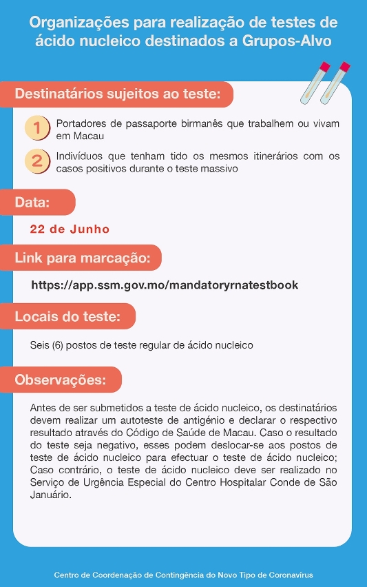 Estas pessoas devem efectuar uma marcação no dia 22 de Junho, através do seguinte link de despistagem gratuita: https://app.ssm.gov.mo/mandatoryrnatestbook para realizar o teste de ácido nucleico em qualquer dos seis (6) postos de teste regular de ácido nucleico.