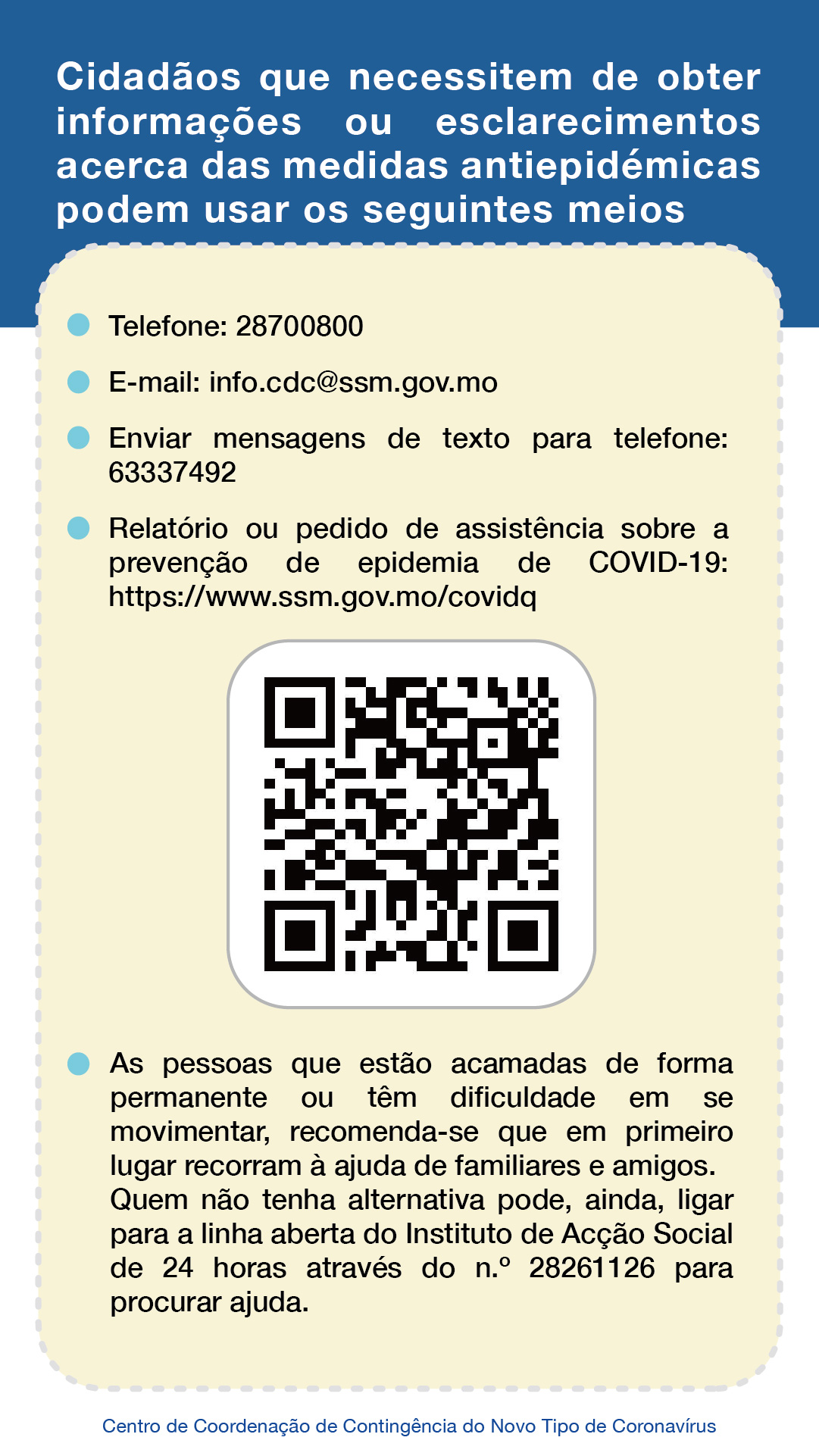 O Centro de Coordenação de Contingência do Novo Tipo de Coronavírus alerta os residentes que necessitem de consulta das informações ou apoio sobre epidemia podem ligar o n.º de telefone (2870 0800), e-mail ( info.cdc@ssm.gov.mo ), mensagem (n.º de telefone: 6333 7492) e plataforma online ( https://www.ssm.gov.mo/covidq ).