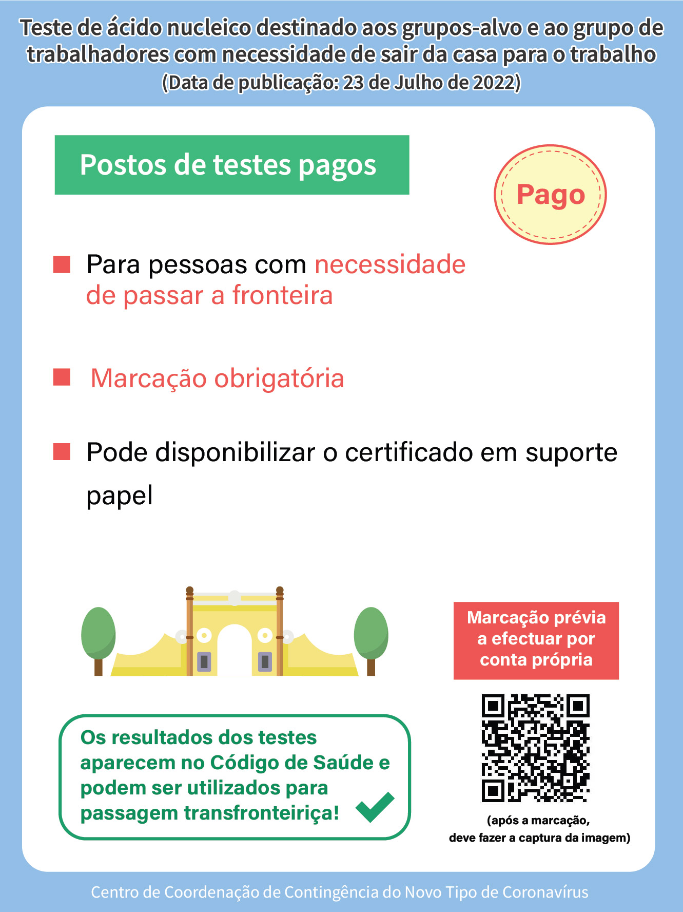 A marcação deve ser efectuada a partir das 06h00 de 24 de Julho de 2022, através da seguinte página electrónica: https://eservice.ssm.gov.mo/allpeoplernatestbook. Os resultados dos testes não podem ser utilizados para as passagens transfronteiriças.