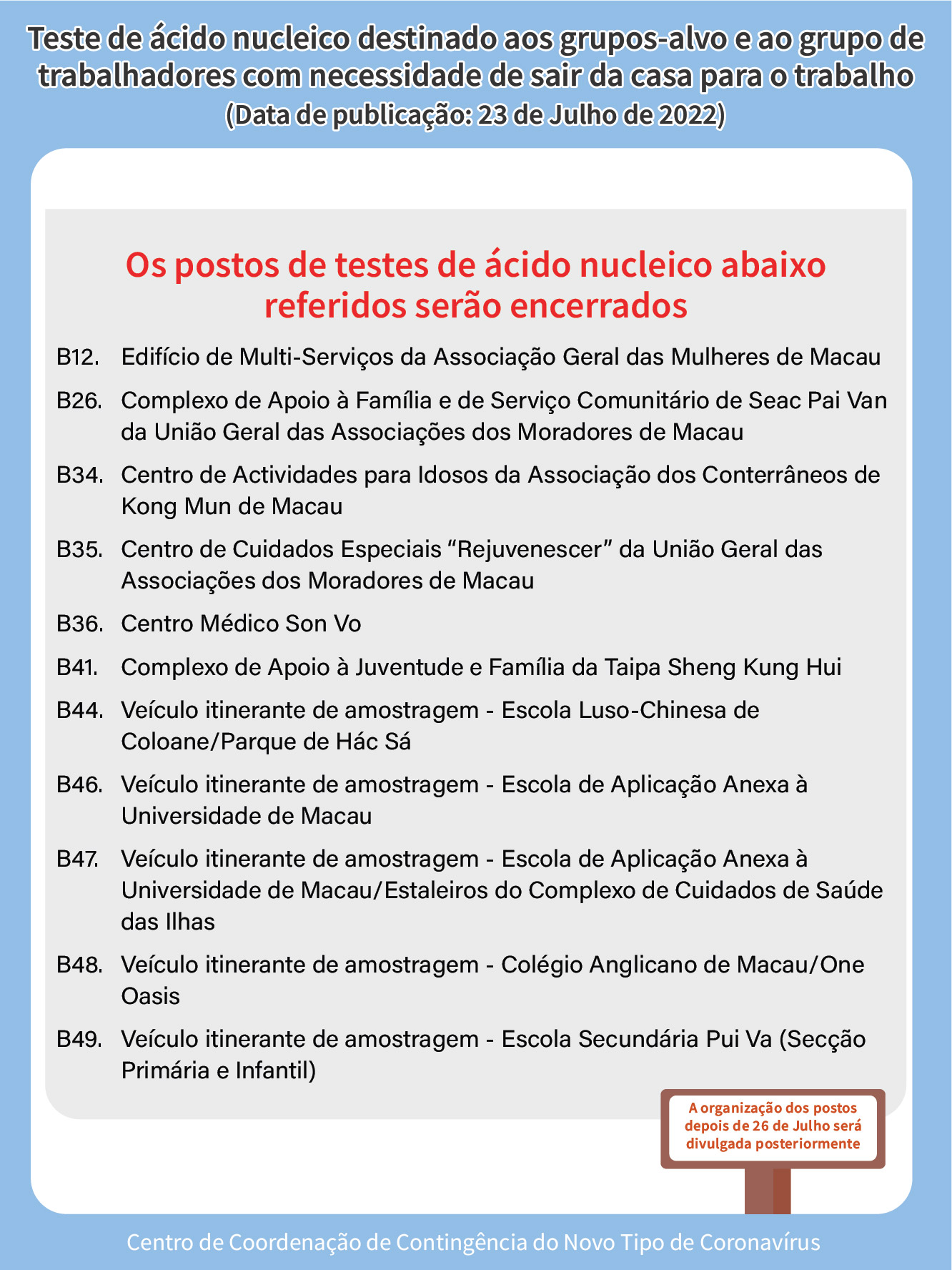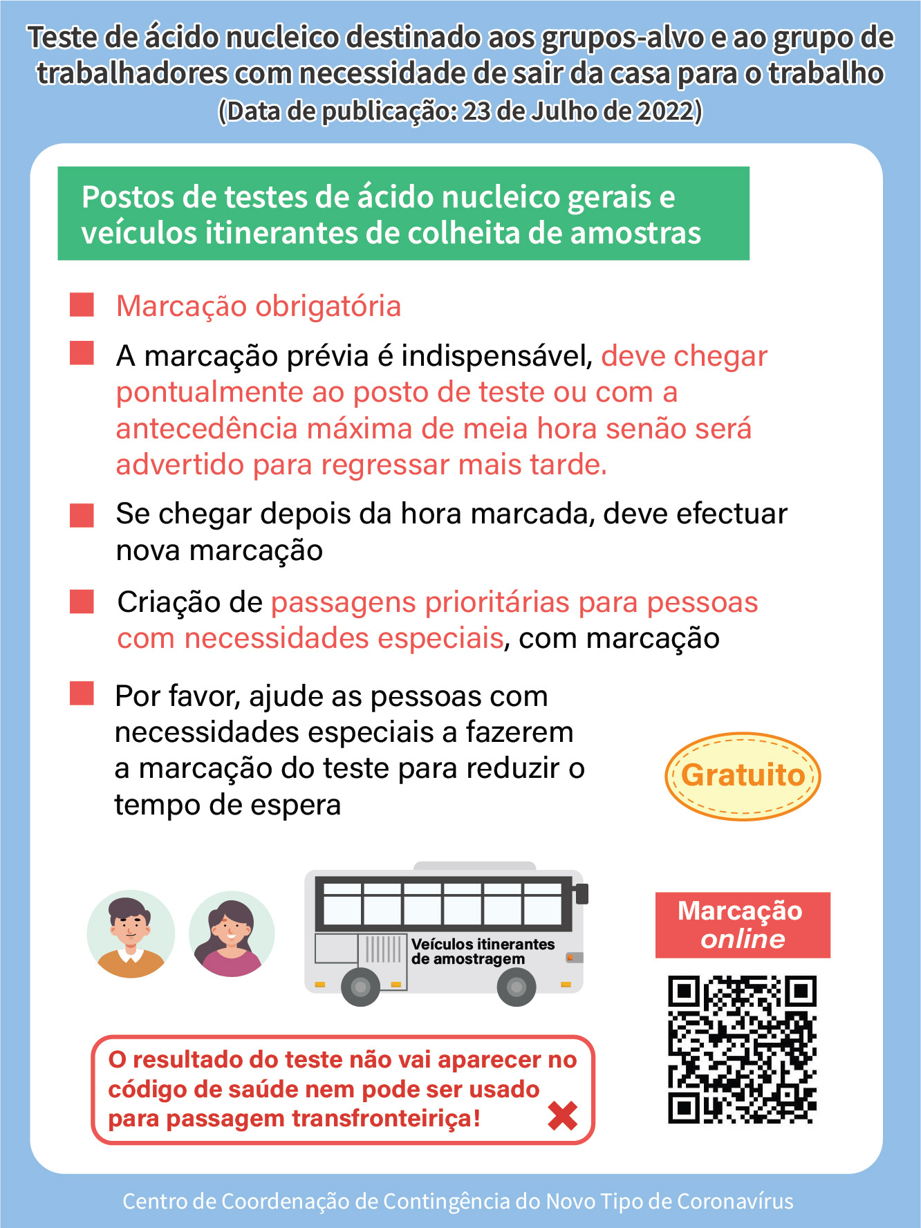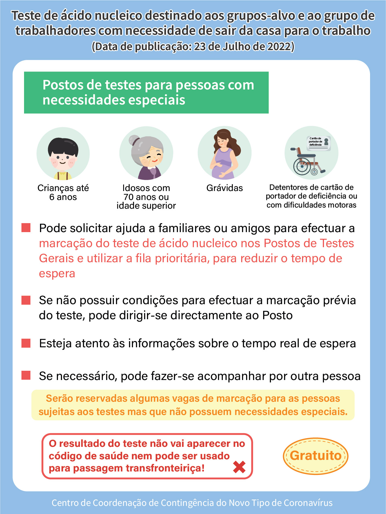- O horário de funcionamento de sete (7) postos específicos destinados a pessoas com necessidades especiais é das 08h00 às 22h00, entre os dias 24 e 26 de Julho, dos quais o horário de funcionamento do posto de testes de ácido nucleico na Escola dos Moradores de Macau, será prolongado para as 24h00.