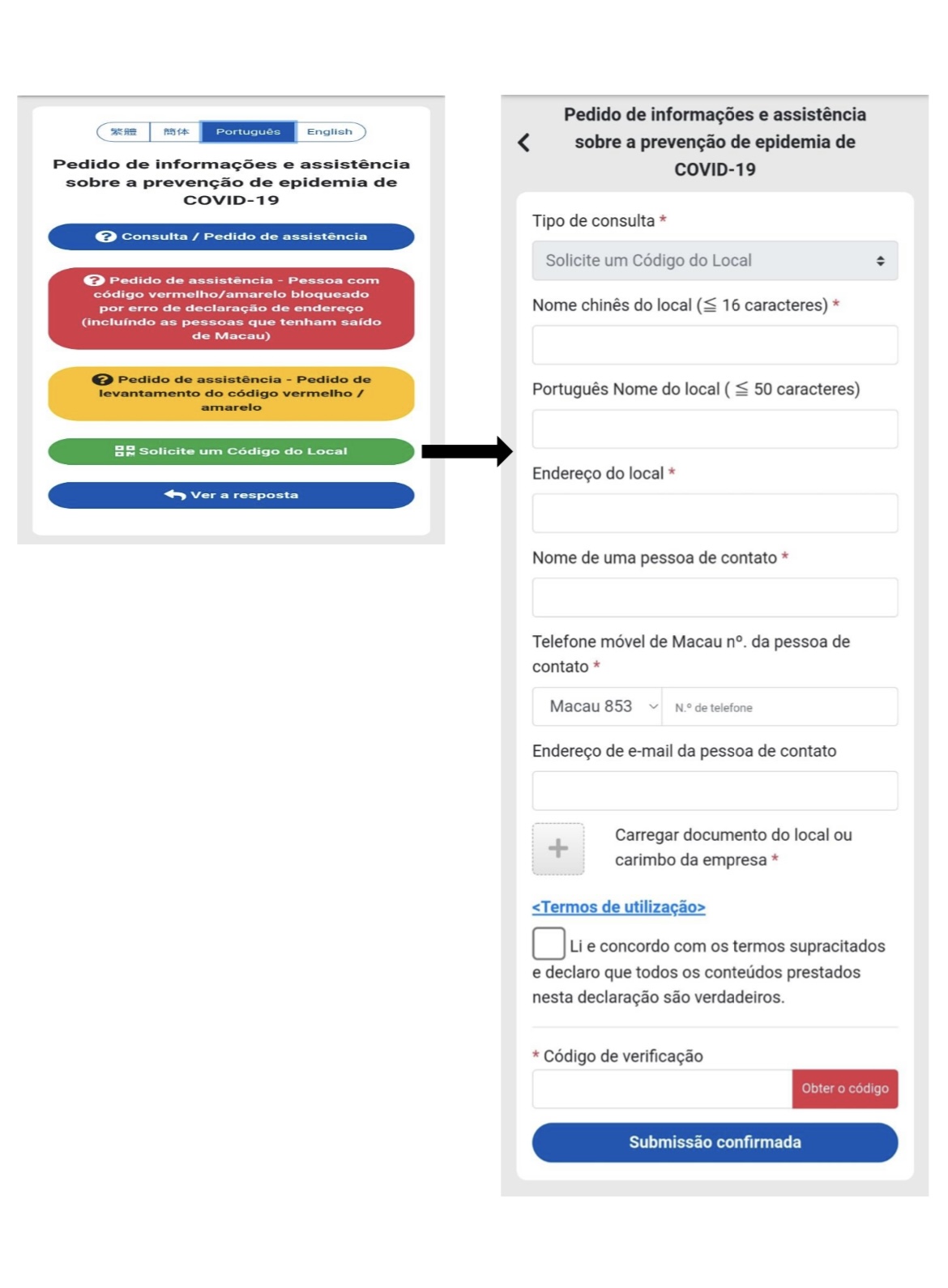 Considerando que alguns locais como lojas de venda a retalho, mercearias, etc. ainda não possuem o Código QR do Local, os Serviços de Saúde criaram uma área específica "Solicite um Código de Local" na plataforma "Pedido de informações e assistência sobre a prevenção de epidemia de COVID-19” no dia 22 de Julho.