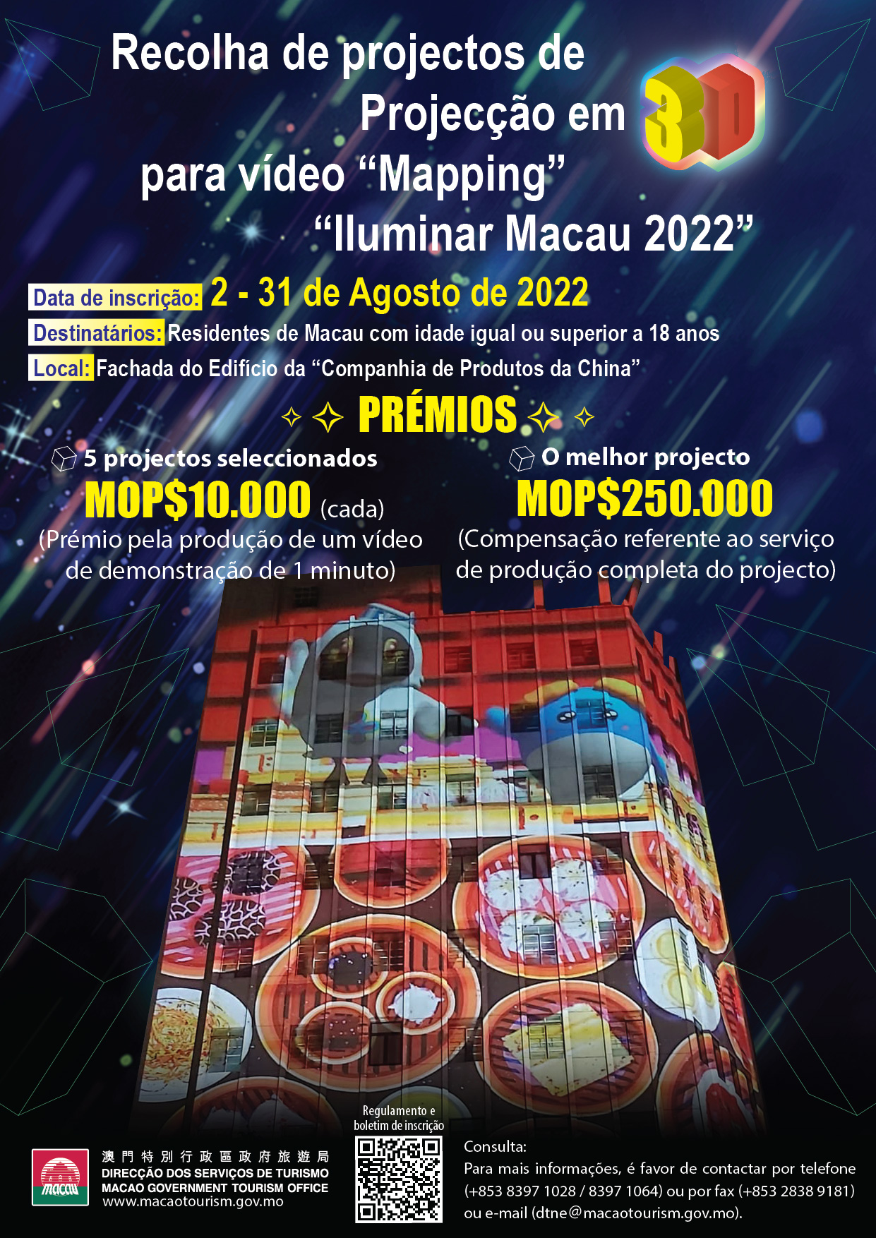 O “Festival de Luz de Macau ”, que tem vindo a ser organizado pela DST nos últimos anos, é agora redesignado “Iluminar Macau 2022”. O evento, que terá lugar em Dezembro deste ano, contará com espectáculos de vídeo mapping, instalações luminosas, jogos interactivos, entre outros, em diferentes zonas de Macau. A fim de promover a integração intersectorial de “turismo +” e incentivar a integração das tecnologias digitais nos grandes eventos turísticos nocturnos, a DST lançará a recolha de projectos de vídeo mapping a 3D para “Iluminar Macau 2022”, esperando atrair mais criações locais. Um júri seleccionará o melhor trabalho para ser apresentado no evento “Iluminar Macau 2022”. Através da demonstração das potencialidades culturais e criativas locais, a DST pretende aumentar o valor agregado dos eventos turísticos nocturnos emblemáticos, criando uma ligação eficaz para o desenvolvimento de “turismo + cultura e criatividade”.