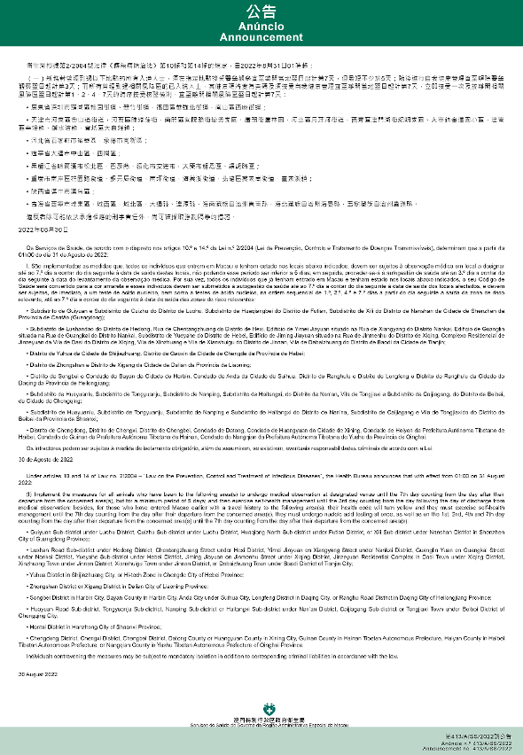 Tendo em consideração a evolução epidemiológica mais actualizada no Interior da China, os Serviços de Saúde, de acordo com os dispostos nos artigos 10.º e 14.º da Lei n.º 2/2004 (Lei de Prevenção, Controlo e Tratamento de Doenças Transmissíveis), determinam que a partir da 01h00 do dia 31 de Agosto de 2022, todos os indivíduos que entrem ou já tenham entrado em Macau e tenham estado nos locais abaixo indicados, devem ser sujeitos à observação médica em local a designar, conforme exigências da autoridade sanitária, por um período de 10 dias a contar da data de saída destes locais, não podendo esse período ser inferior a 7 dias, e no dia em que complete 14 dias após a saída de determinados locais devem submeter-se a um teste de ácido nucleico, se o teste for negativo, permite, também a entrada no Interior da China através de Macau: