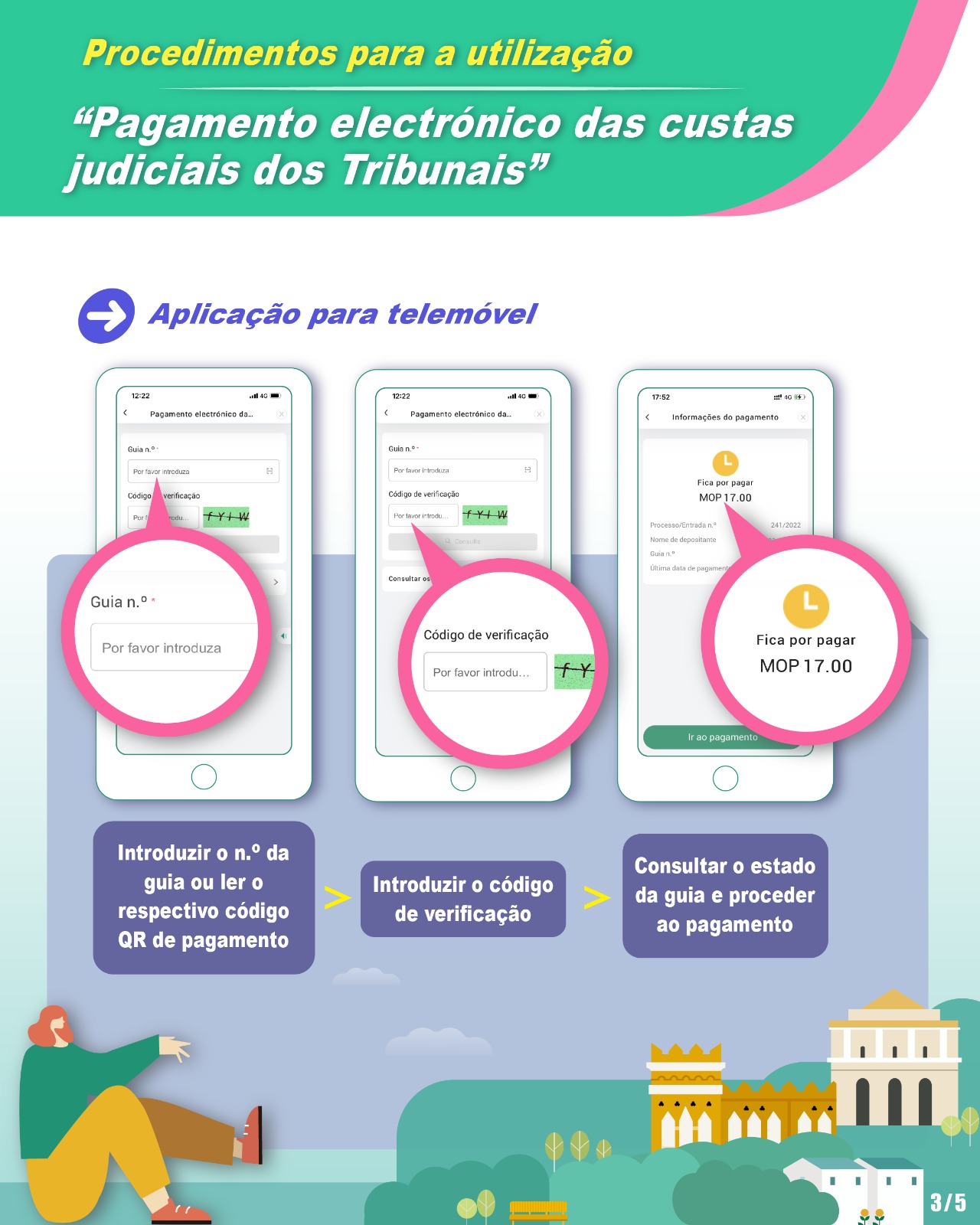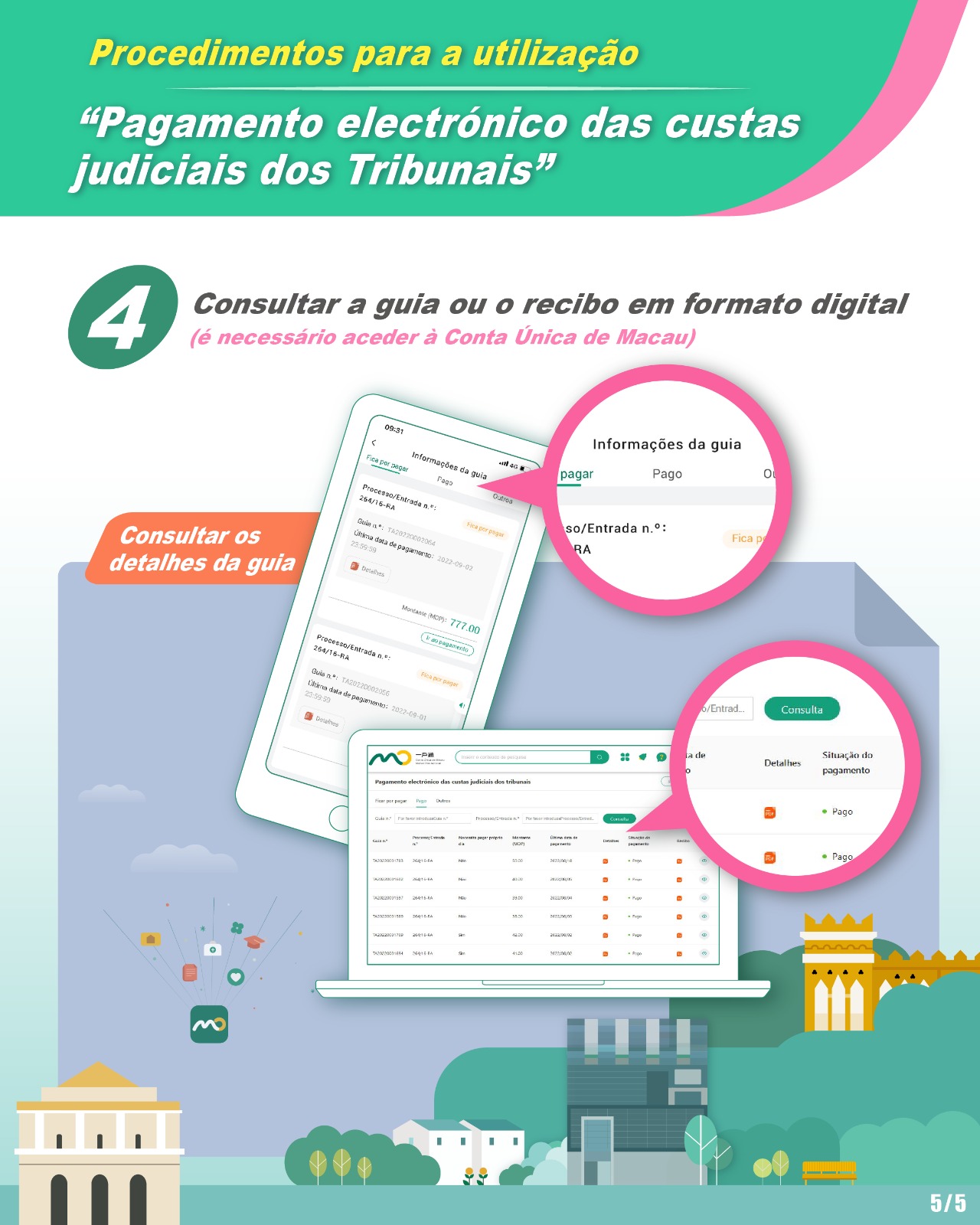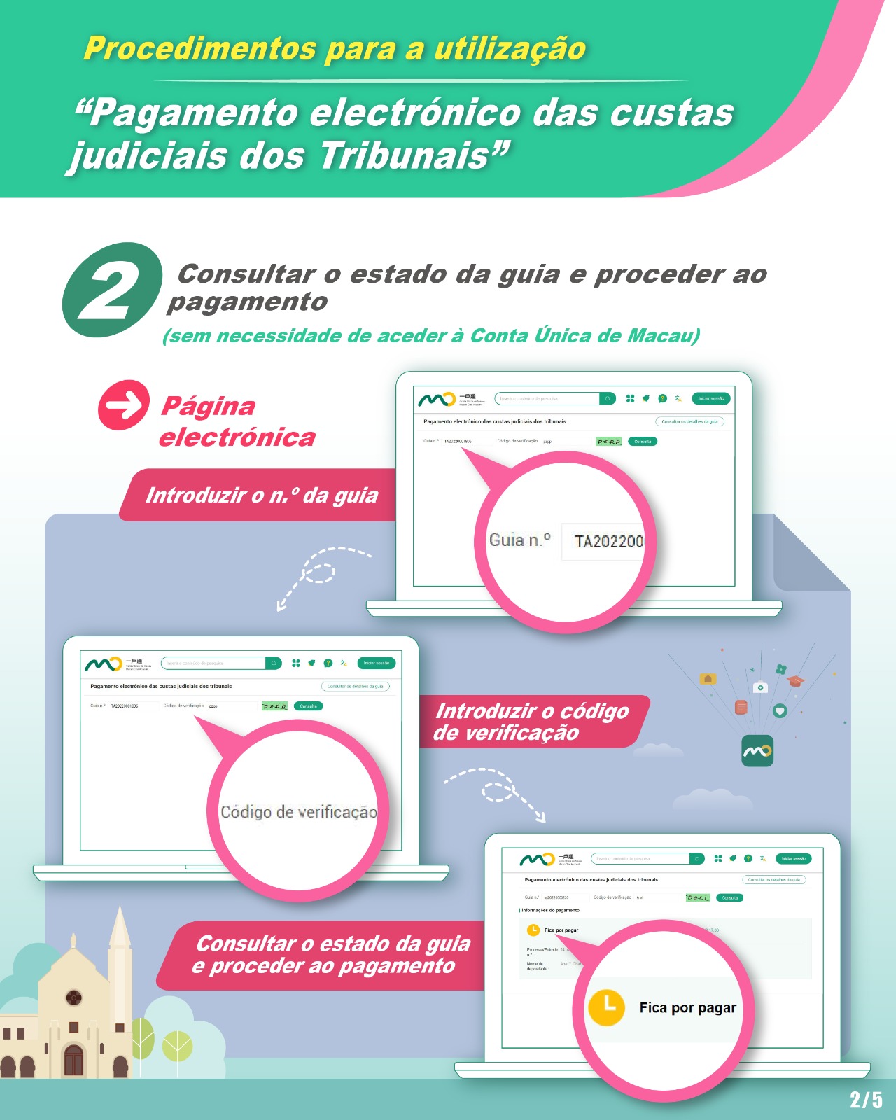 No âmbito do pagamento das custas judiciais, para além do pagamento presencial nos Tribunais ou na Caixa Económica Postal, o detentor da guia emitida pelos tribunais das diversas instâncias a partir de 1 de Setembro, pode efectuar, antes do termo do prazo de pagamento, o pagamento online através da Plataforma Electrónica dos Tribunais ou da Conta Única de Macau, introduzindo o número da guia ou escaneando o código QR de pagamento, sem necessidade de fazer o login através da Conta Única de Macau.