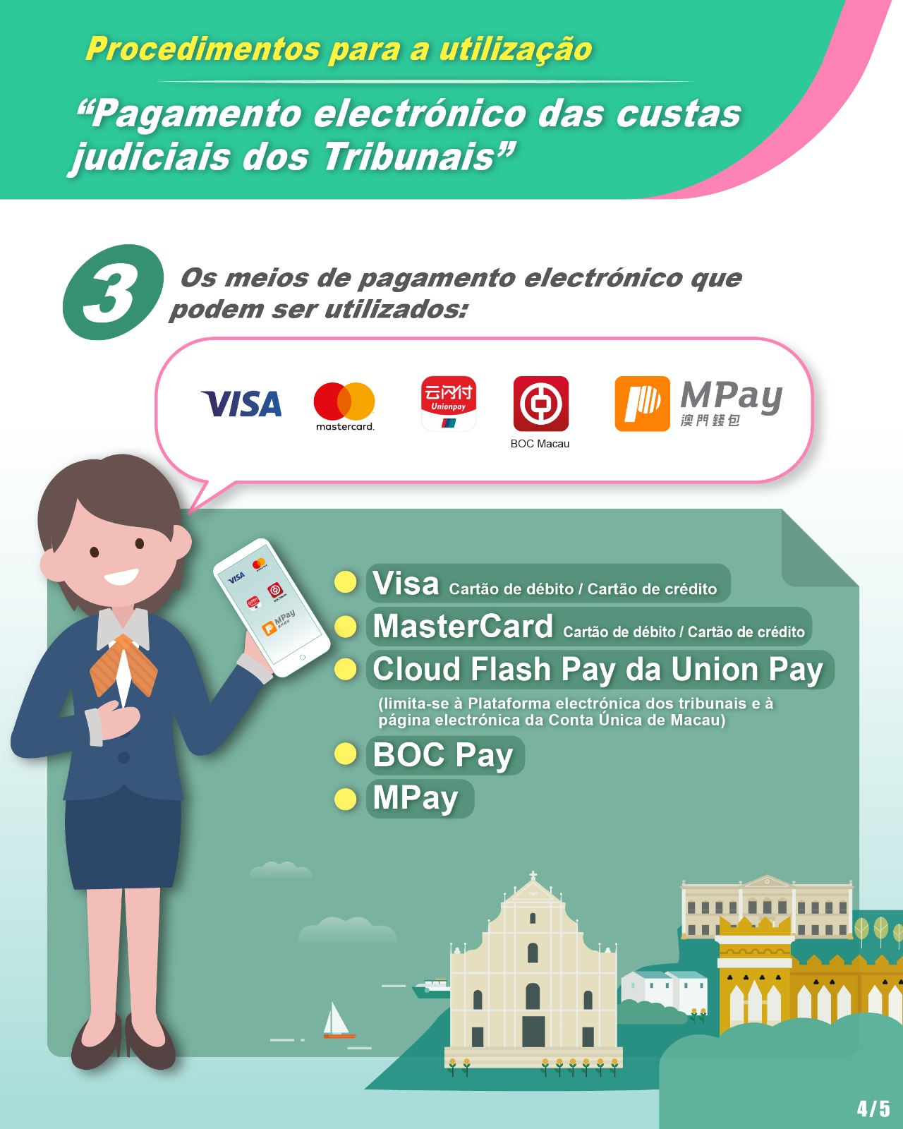Seguem-se os meios de pagamento offline aceitáveis pelas recebedorias sitas no Edifício dos Juízos Criminais do Tribunal Judicial de Base e nas secretarias dos juízos da Macau Square, bem como os meios de pagamento online aceitáveis pela Plataforma Electrónica dos Tribunais e pela Conta Única de Macau: