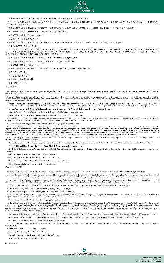 Tendo em consideração a evolução epidemiológica mais actualizada no Interior da China, os Serviços de Saúde, de acordo com o disposto nos artigos 10.º e 14.º da Lei n.º 2/2004 (Lei de Prevenção, Controlo e Tratamento de Doenças Transmissíveis), determinam que a partir da 01h00 do dia 8 de Setembro de 2022, são implementadas ou canceladas as medidas antiepidémicas para quem tenha estado em diversas áreas do Interior da China: