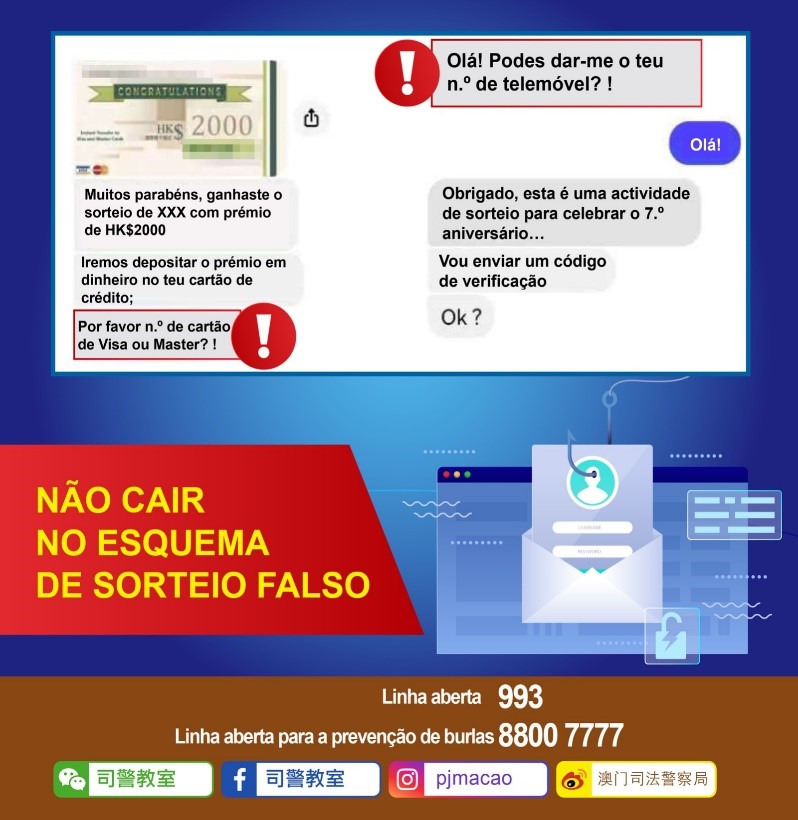 A Polícia Judiciária recentemente recebeu denúncias de alguns residentes, dizendo que não conseguiram fazer login na sua conta de rede social, e, posteriormente, que tinham recebido chamadas telefónicas de familiares e amigos dizendo terem recebido mensagens emitidas das contas deles, informando-os de terem ganho prémio num sorteio de uma plataforma de compras online de grande escala da região vizinha. Numa das mensagens era-lhes pedido que preenchessem informações pessoais para receber o prémio. As vítimas suspeitam que suas contas da rede social tenham sido furtadas.