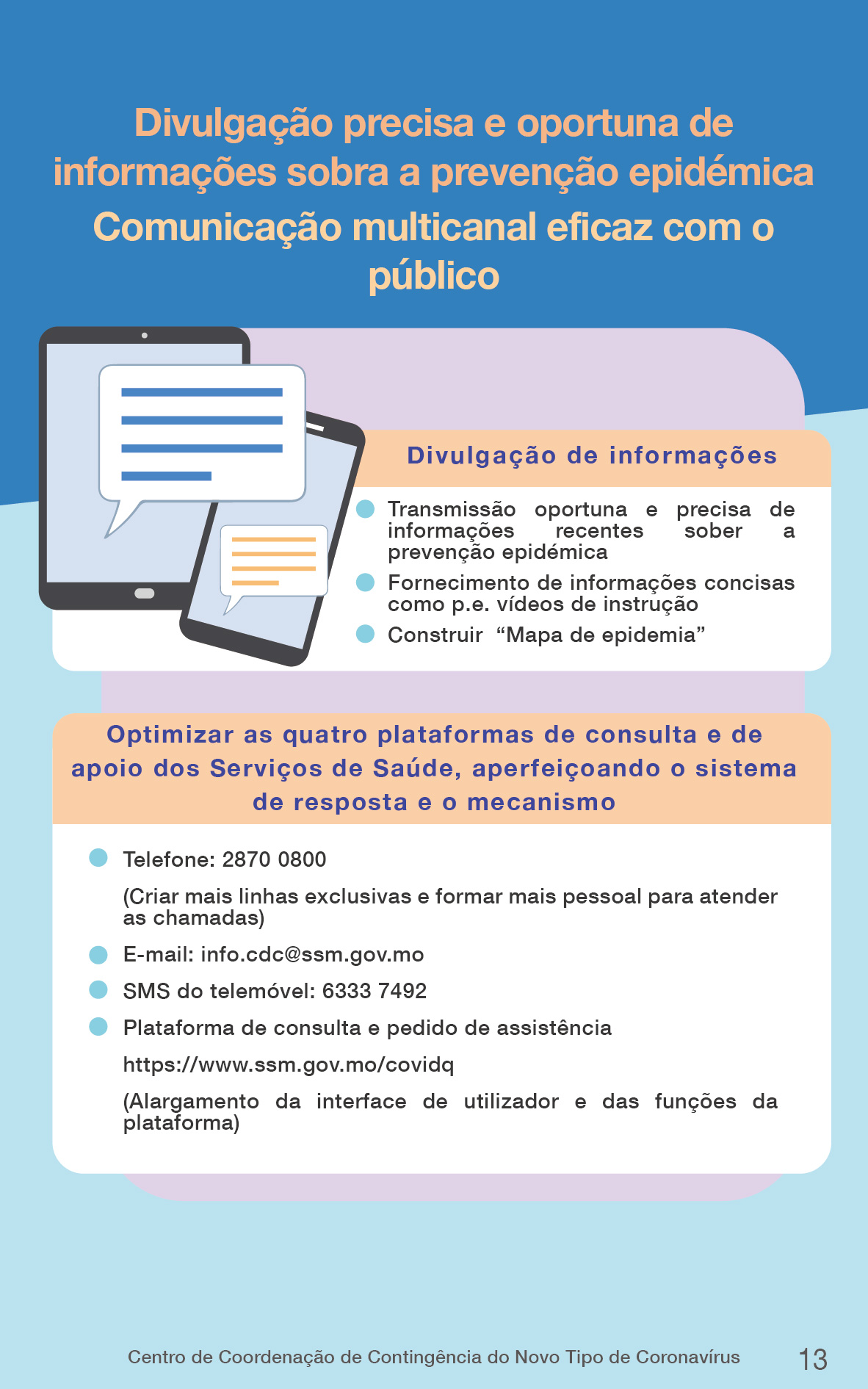Segundo o Centro de Coordenação, os planos de contingência, que servem de documento-quadro, são uma orientação importante para a luta contra a epidemia em Macau. O Governo da RAEM, com base nos planos de contingência definidos, através dos 15 grupos especializados, continuará a aperfeiçoar e a pormenorizar todos os trabalhos preparativos para a luta contra a epidemia, a ajustar e optimizar, de forma contínua, as diversas medidas de prevenção de acordo com as características das variantes das estirpes e a evolução real da epidemia.
