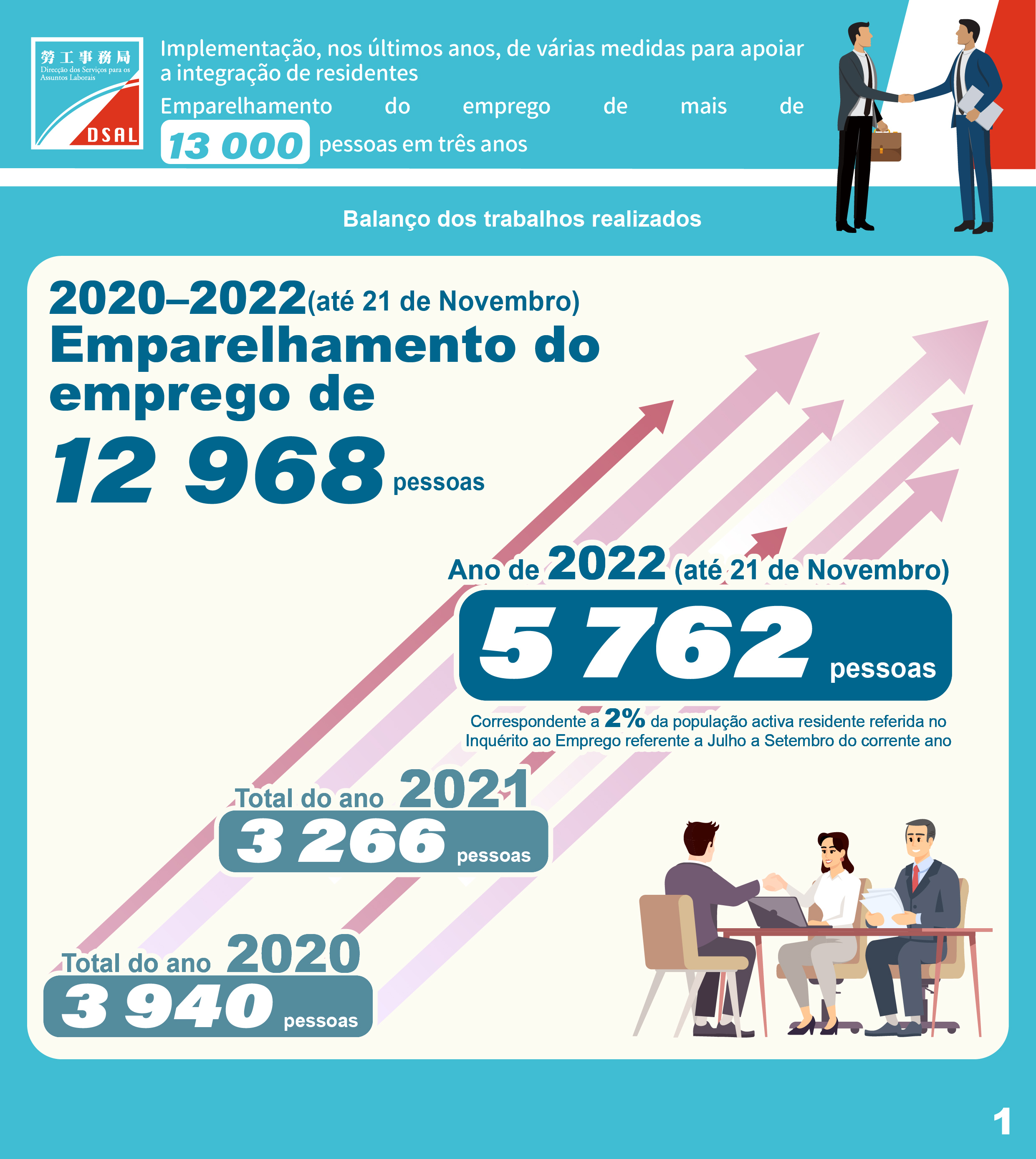 Para minimizar o impacto da epidemia no emprego dos residentes de Macau, a partir de 2020, a Direcção dos Serviços para os Assuntos Laborais (DSAL) lançou, empenhadamente, várias medidas de apoio ao emprego dos residentes, designadamente o emparelhamento de emprego, aconselhamento de emprego, planos de estágio, entre outros, para dar apoio, de várias formas, aos residentes no acesso ao emprego. Através dessas medidas, registou-se um aumento significativo no número de pessoas que conseguiram fazer o emparelhamento de emprego por ano. Desde o início do ano até 21 de Novembro, através da organização de 69 sessões de emparelhamento para sectores específicos, 57 sessões de emparelhamento para as empresas de lazer e 2 sessões de recrutamento de grande dimensão, perfazendo um total de 128 sessões, bem como através dos serviços habituais de conjugação online e offline, a DSAL ajudou um total de 5 762 residentes a serem contratados, dos quais 942 foram da construção civil, correspondendo a cerca de 2% da população activa dos residentes indicada no Inquérito ao emprego referente ao período de Julho a Setembro do corrente ano.
