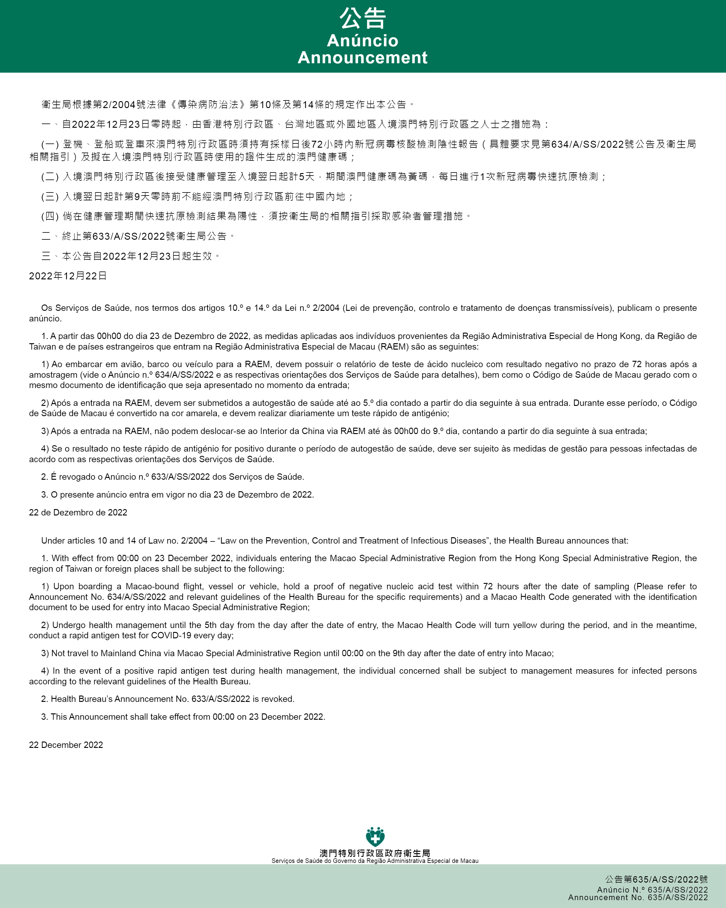 O Centro de Coordenação de Contingência do Novo Tipo de Coronavírus anunciou que, em resposta à situação epidémica e ao ajustamento das políticas de prevenção e controlo, a partir das 00h00 de 23 de Dezembro de 2022, serão ajustadas as medidas antiepidémicas para pessoas que entrem na Região Administrativa Especial de Macau provenientes da Região Administrativa Especial de Hong Kong, da Região de Taiwan e dos países estrangeiros da seguinte forma: