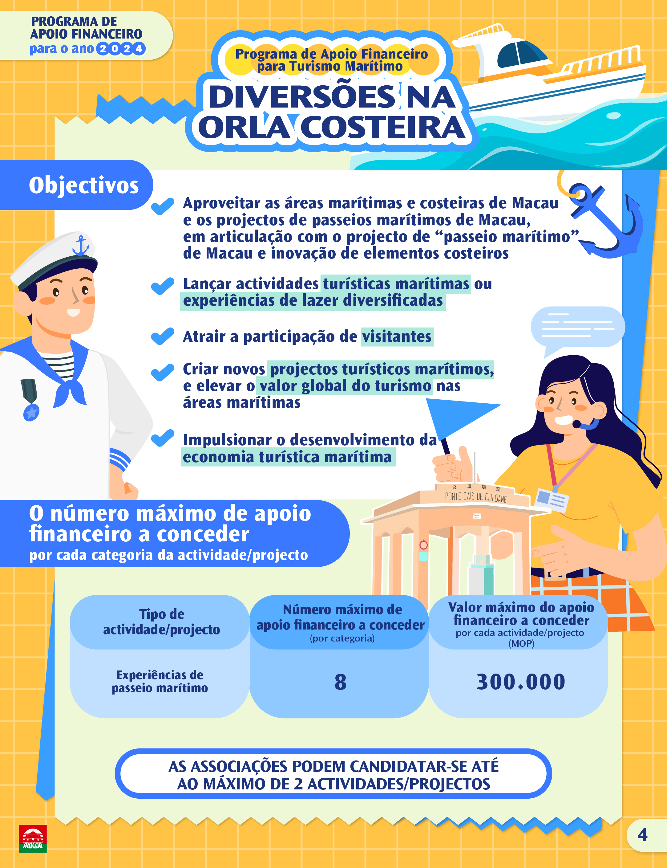 Programa de Apoio Financeiro para o Turismo Marítimo “Diversões na orla costeira”: Aproveitar as áreas marítimas e costeiras de Macau, em articulação com o projecto de passeios marítimos e a inovação dos elementos costeiros, para lançar actividades turísticas ou experiências de lazer diversificadas, atrair a participação de visitantes estrangeiros, de modo a desenvolver projectos de turismo marítimo e elevar o valor global do turismo nas áreas marítimas.