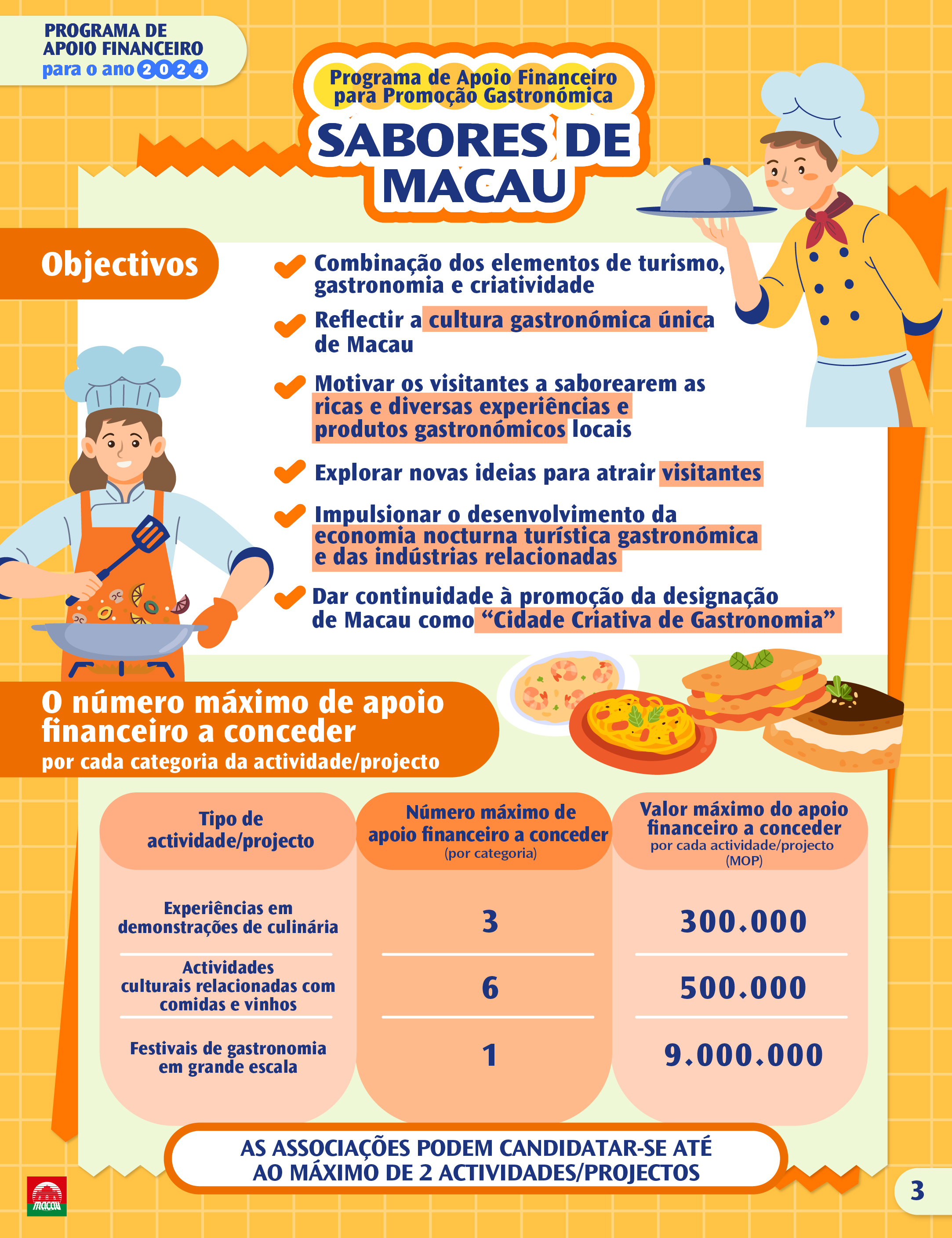 Programa de Apoio Financeiro para a Promoção Gastronómica “Sabores de Macau”: Combinar elementos de turismo, gastronomia e criatividade para reflectir a cultura gastronómica única de Macau, proporcionar experiências e produtos gastronómicos diversificados aos visitantes, explorar novas ideias para atrair visitantes internacionais, e promover a imagem de Macau como Cidade Criativa de Gastronomia.