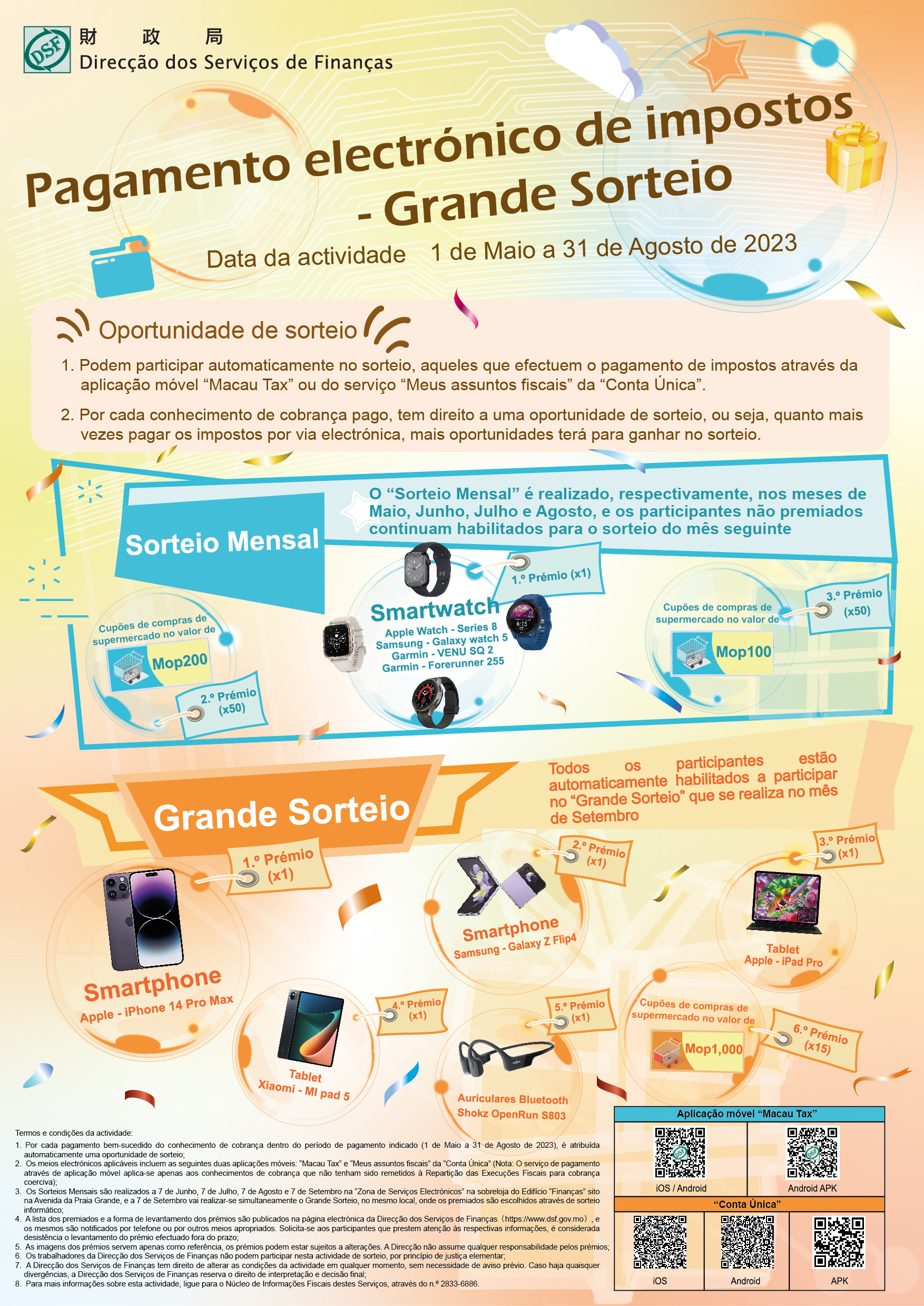 A fim de melhor promover as vias electrónicas de pagamento do imposto, bem como incentivar a declaração fiscal pelos contribuintes através de telemóvel, de quiosque de auto-atendimento e da Internet, a Direcção dos Serviços de Finanças (DSF) realizou, no primeiro trimestre do corrente ano, o sorteio no âmbito da declaração electrónica. Posteriormente, foi lançado o evento de sorteio numa segunda fase – Grande Sorteio no Pagamento Electrónico do Imposto. Assim, todos aqueles que, entre 1 de Maio e 31 de Agosto de 2023, fizeram o pagamento fiscal por: aplicação móvel “Macau Tax” ou “Conta Única – Meus assuntos fiscais”, ficaram, automaticamente, submetidos ao sorteio. Os vencedores dos sorteios mensais de Maio, Junho e Julho, num total de 303 pessoas, já foram sorteados em 7 de Junho, 7 de Julho e 7 de Agosto, respectivamente, tendo sido notificados os mesmos para o levantamento dos prémios.