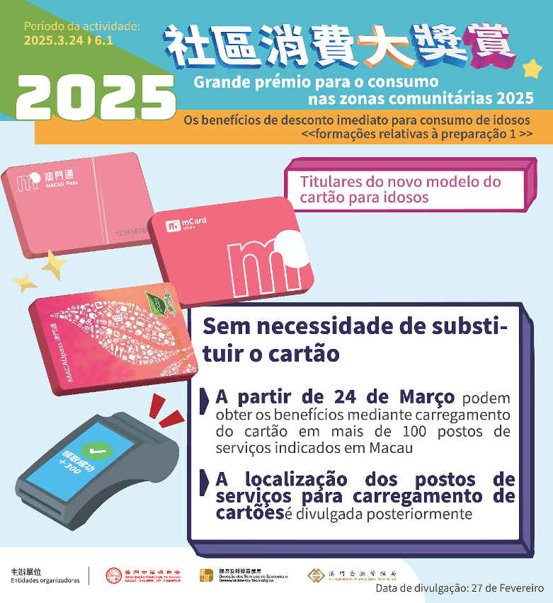 Os portadores da versão nova do “Cartão da Macau Pass para Idosos”, podem obter os benefícios de desconto imediato mediante carregamento do cartão em mais de 100 postos de serviços indicados instalados em Macau a partir do dia 24 de Março. Os pormenores relativos aos postos de serviço serão publicados posteriormente.