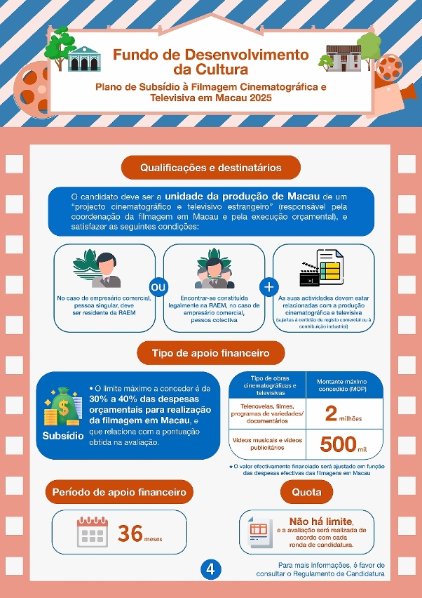 O Fundo de Desenvolvimento da Cultura (FDC) continua a lançar o “Plano de Subsídio à Filmagem Cinematográfica e Televisiva em Macau”, visando incentivar equipas do exterior para a filmagem em Macau, promovendo a imagem de Macau e aumentando o prestígio internacional da RAEM através de obras cinematográficas e televisivas, de modo a impulsionar a sinergia da criatividade cultural e do turismo, bem como promover o desenvolvimento da indústria cinematográfica e televisiva de Macau.