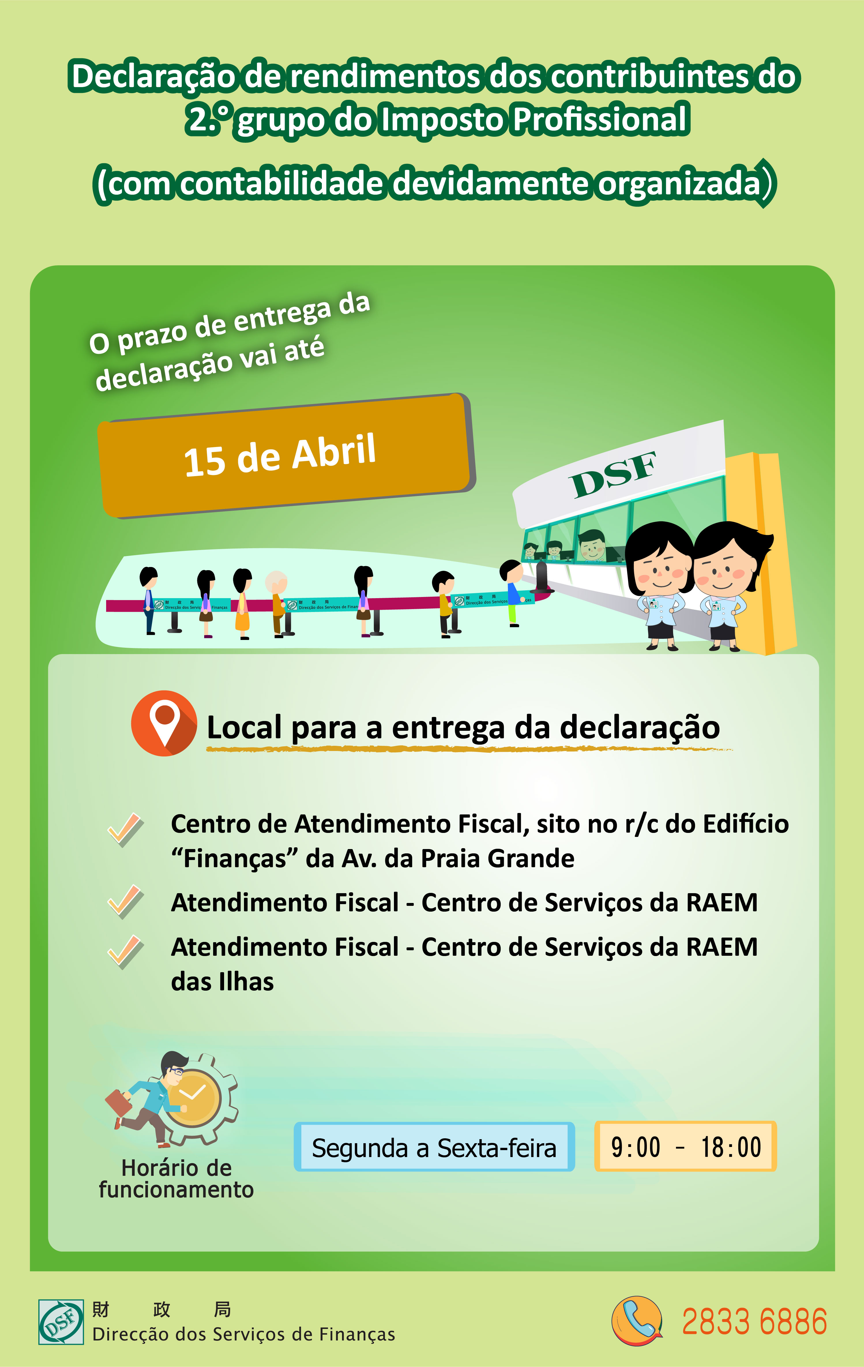 Nos termos do n.º 1 do artigo 11.º do Regulamento do Imposto Profissional, aprovado pela Lei n.º 2/78/M, os contribuintes do 2.º grupo (profissões liberais e técnicas) do Imposto Profissional, com contabilidade devidamente organizada, devem entregar, antes do dia 15 de Abril, a declaração de rendimentos, modelo M/5, de todas as remunerações ou rendimentos recebidos ou postos à sua disposição no exercício de 2024.