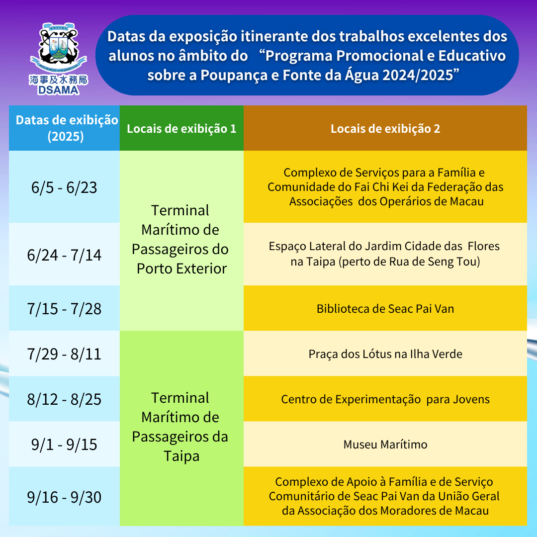A Direcção dos Serviços de Assuntos Marítimos e de Água (DSAMA) realizará, entre 5 de Junho e 30 de Setembro de 2025, a exposição itinerante dos trabalhos excelentes dos alunos do “Programa Promocional e Educativo sobre a Poupança e Fonte da Água 2024/2025”, serão exibidos 100 trabalhos premiados e excelentes subordinados ao tema da água reciclada em vários bairros e pavilhões de Macau. Esta exposição itinerante tem como objectivo divulgar ao público, através dos trabalhos criativos dos alunos, o conceito de poupança de água e os conhecimentos sobre a água reciclada, bem como promover as ideias de “Pensar na fonte de água” e “Poupar água”.