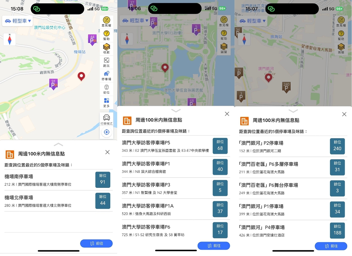 Além disso, quando os condutores usam o modo de planeamento de viagem da aplicação “Macao Smart Go”, esta sugere automaticamente o parque de estacionamento mais próximo do destino como alternativa. Se o destino for um parque de estacionamento, o sistema fornece em tempo real informações sobre vagas disponíveis durante o percurso. Caso não haja vagas suficientes no destino, a aplicação apresenta outras opções até 500 metros de distância.
