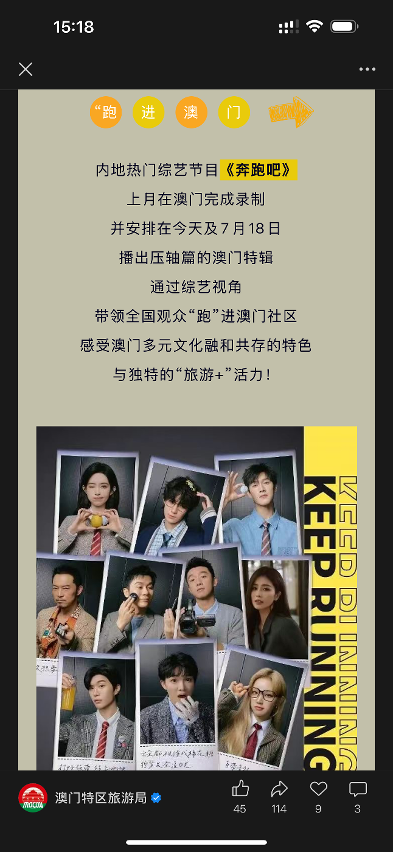 Os dois episódios temáticos de Macau do “Keep Running” encerraram a 13.ª temporada do programa, com apresentadores e várias celebridades a levarem o púbico de todo o Interior da China a percorrer as ruas da Avenida de Almeida Ribeiro, da Rua da Felicidade e do Jardim do Mercado de Iao Hon. Pelo caminho foram realizados desafios interessantes e provas de gastronomia típica, bem como visitas às instalações de entretenimento das empresas de turismo e lazer integrado, mostrando, de forma vívida, o profundo conteúdo do Centro Histórico de Macau e o encanto como Cidade Criativa de Gastronomia. Sob o tema “Amar e Agir pelo Bem”, o programa proporcionou ainda às celebridades participantes uma experiência de voluntariando nos bairros da cidade, permitindo-lhes sentir de perto o espírito caloroso da comunidade local.