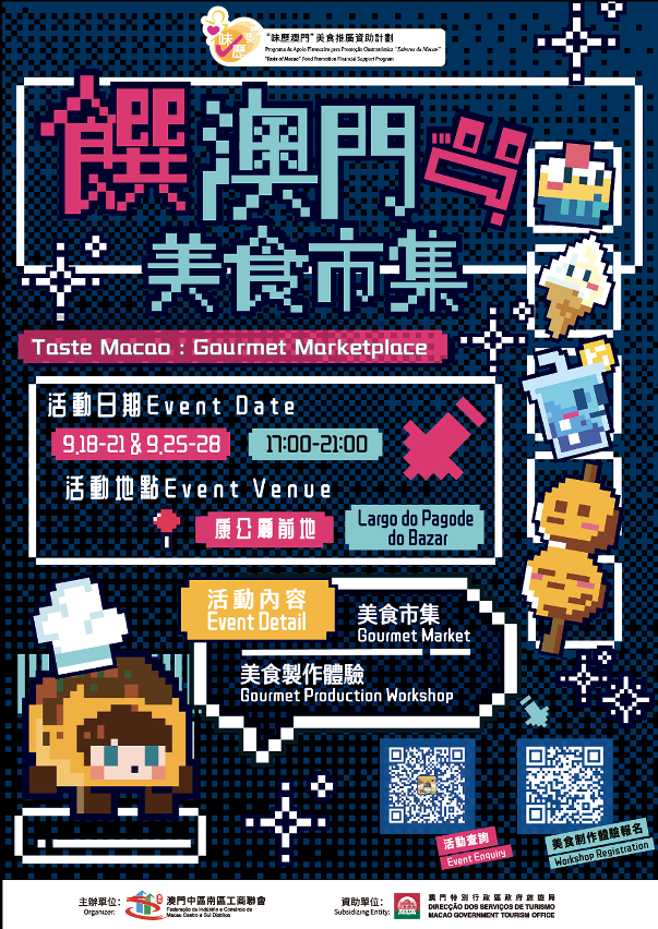 O “Taste Macao: Gourmet Marketplace” terá lugar entre 18 e 28 de Setembro, todas as quintas-feiras, sextas-feiras, sábados e domingos, das 17h00 às 21h00, no Largo do Pagode do Bazar. Além de 20 bancas de comidas e bebidas e espectáculos flash mob, haverá ainda experiências de produção gastronómica em determinadas horas. O evento, em conjunto com o mercado nocturno do Pagode do Bazar, irá atrair o fluxo de pessoas, tornando o ambiente comunitário mais animado e alegre.