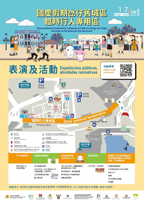 Para mais informações detalhadas sobre programas e espectáculos nas zonas pedonais, queiram visitar a respectiva página exclusiva e atender às informações divulgadas por serviços competentes.