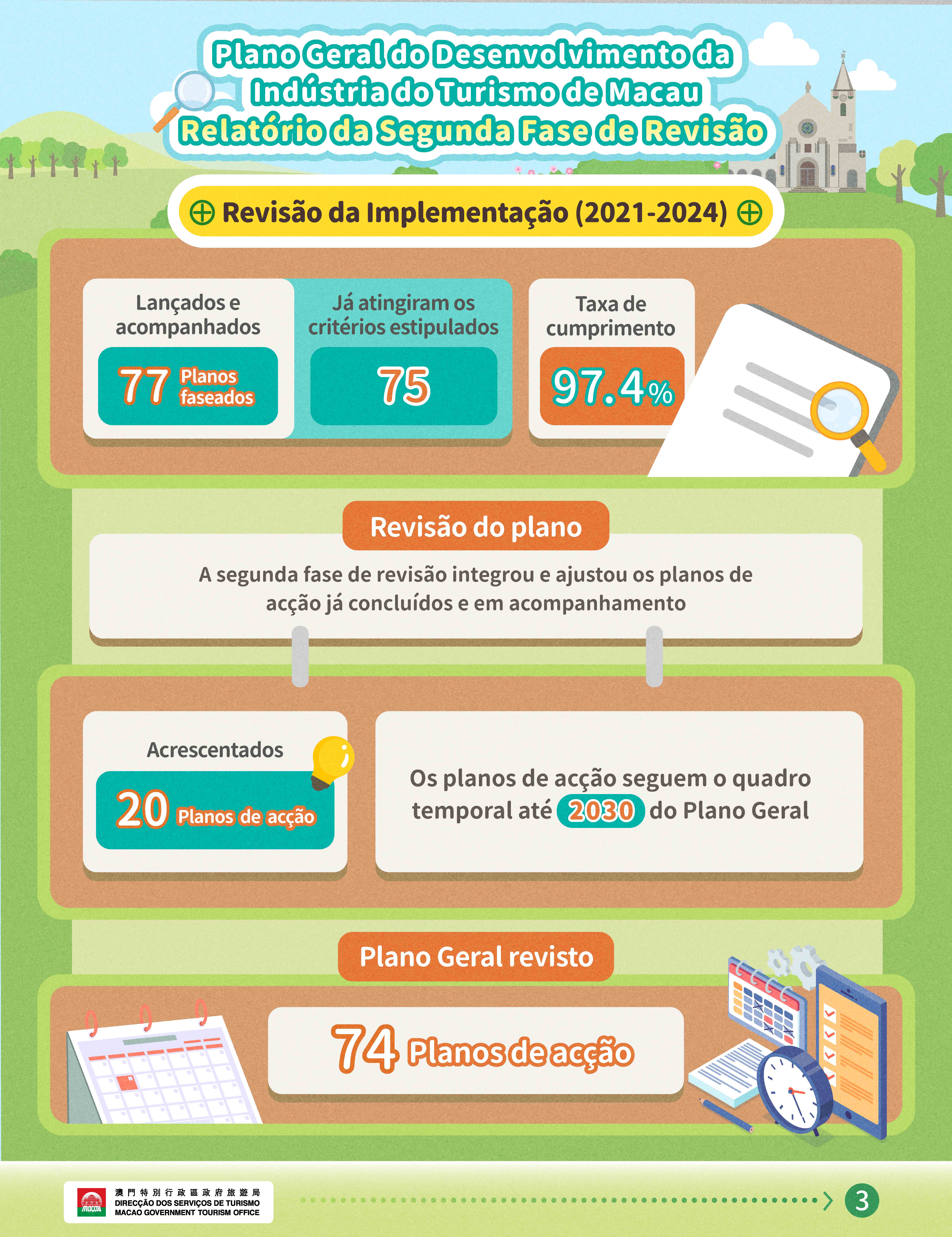 O relatório da segunda fase de revisão inclui ainda indicadores-chave e tendências para 2030 para consulta do público. Os interessados podem descarregar o relatório da segunda fase de revisão do Plano Geral do Desenvolvimento da Indústria do Turismo de Macau (versão em chinês, português e inglês) em: masterplan.macaotourism.gov.mo.