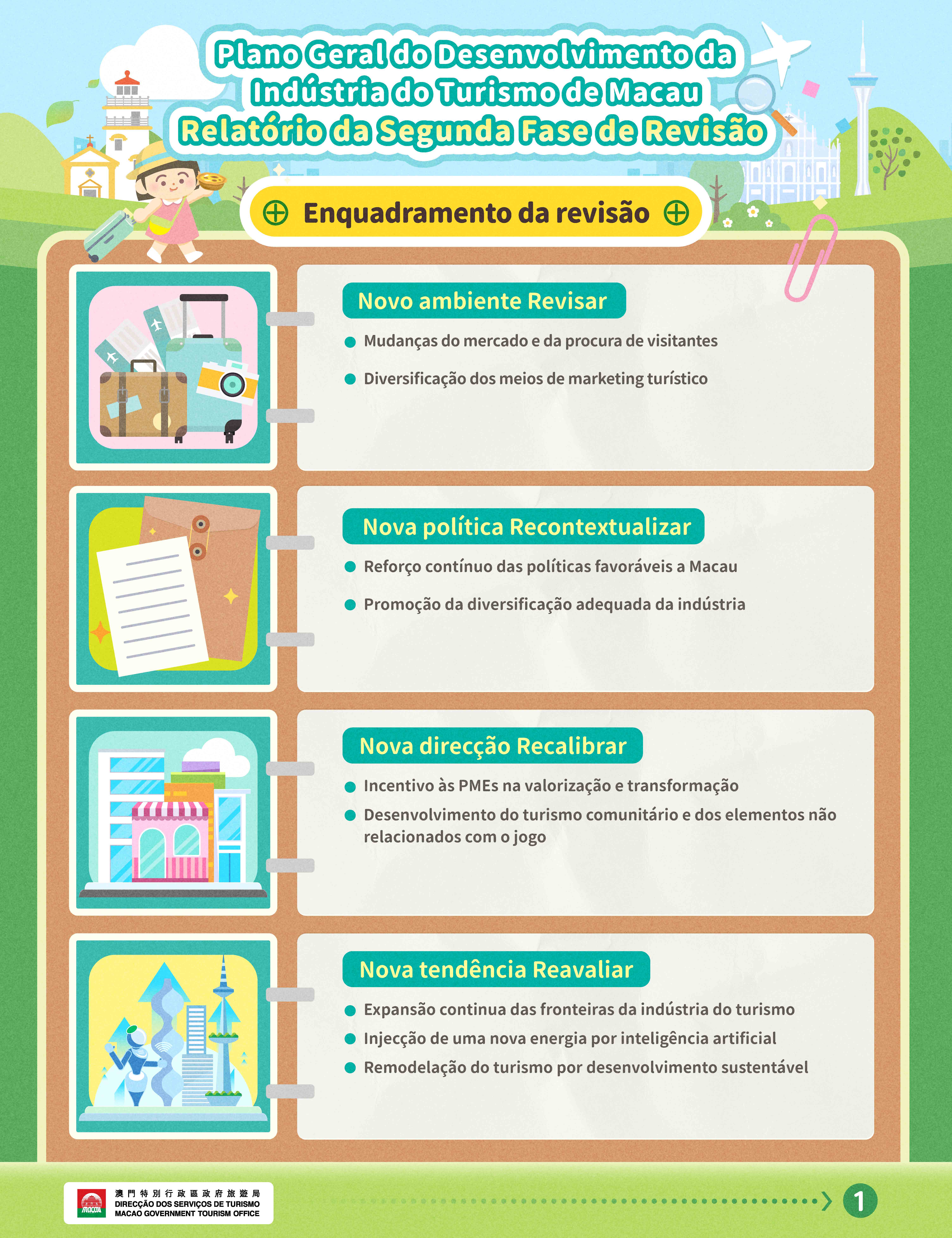 Com a aceleração das mudanças no mercado mundial, o impacto do novo ambiente global na indústria do turismo de Macau, em conjunto com a entrada em vigor nos últimos anos de uma série de políticas nacionais favoráveis à RAEM, e ainda novas tendências de viagem, tornou-se necessário reavaliar a direcção e percurso concreto de desenvolvimento, para impulsionar a concretização de um desenvolvimento qualitativo da indústria. Por este motivo, em 2024 a DST incumbiu uma instituição de investigação para realizar a segunda fase do estudo de revisão do Plano Geral do Desenvolvimento da Indústria do Turismo de Macau